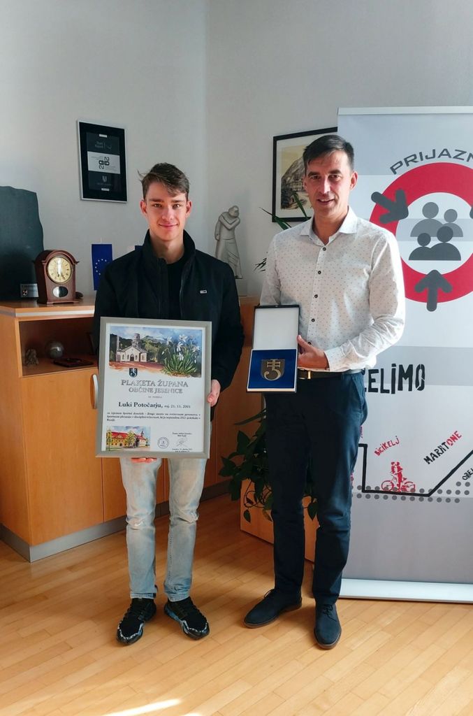 Župan občine Jesenice Blaž Račič je danes v svojem kabinetu sprejel Luko Potočarja, 19-letnega Jeseničana, ki je na nedavnem svetovnem prvenstvu v Rusiji v športnem plezanju v kategoriji težavnost osvojil srebrno medaljo. Župan je mlademu podprvaku čestital in poudaril, da je Lukov dosežek tisto, zaradi česar so Jesenice lahko izredno ponosne. Prav slednje pa utemeljuje tudi njegovo odločitev, da je Luki ob tej priložnosti podelil plaketo župana, eno od treh najpomembnejših občinskih priznanj.