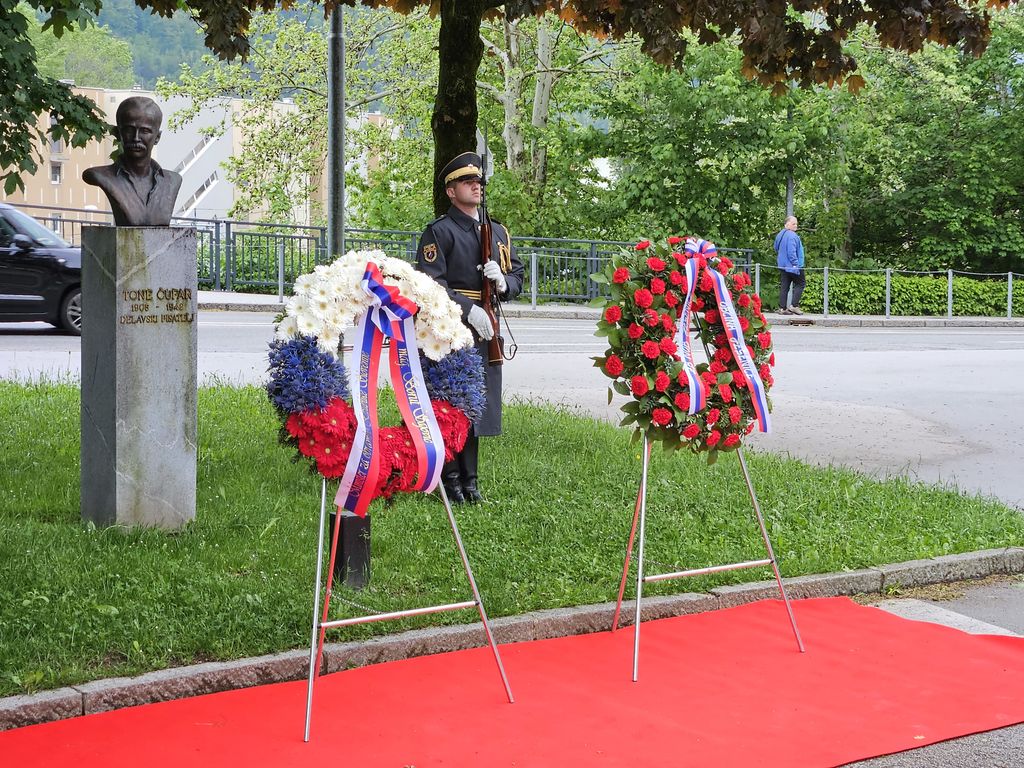 Uvodni del slovesnosti se je odvil na Trgu Toneta Čufarja s položitvijo vencev k doprsnima kipoma pesnikov in pisateljev Toneta Čufarja ter Mihe Klinarja. Ob navzočnosti častne straže Slovenske vojske, praporščakov in Pihalnega orkestra Jesenice – Kranjska Gora je najprej venec položil minister za obrambo Republike Slovenije mag. Borut Sajovic, za njim pa župan Občine Jesenice mag. Peter Bohinec in predsednik Združenja borcev za vrednote NOB Jesenice Izidor Podgornik.