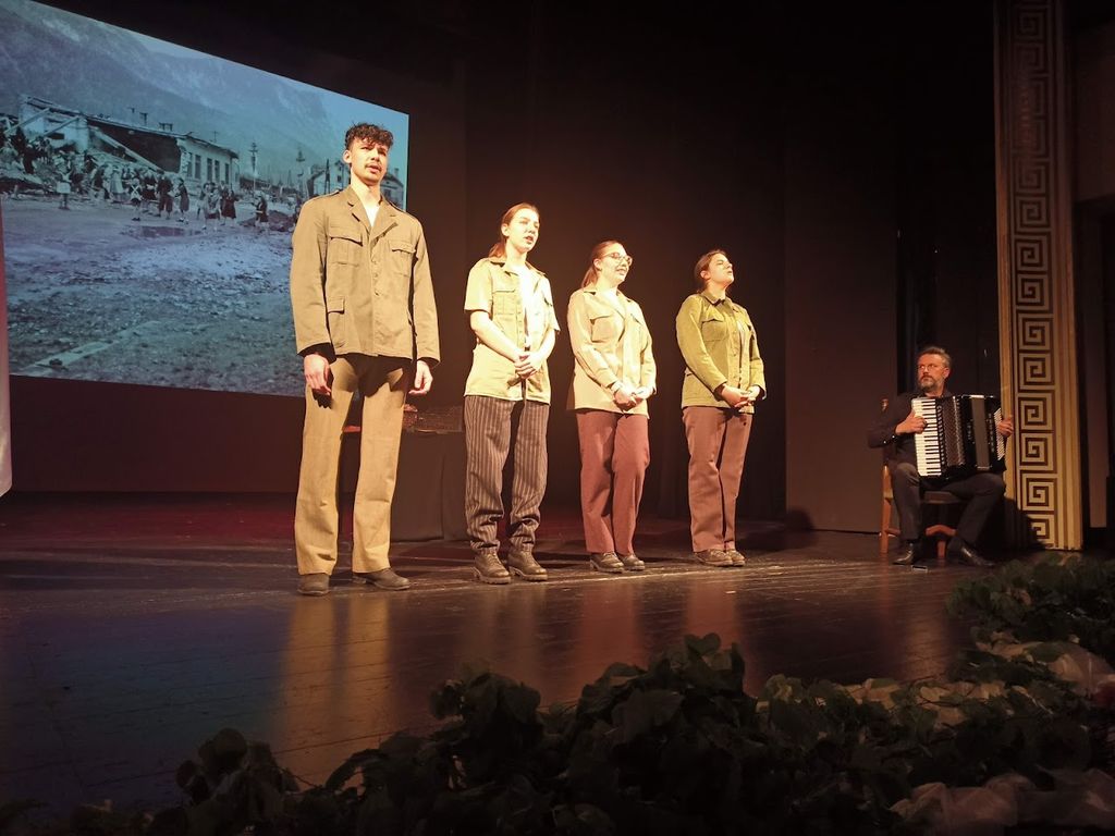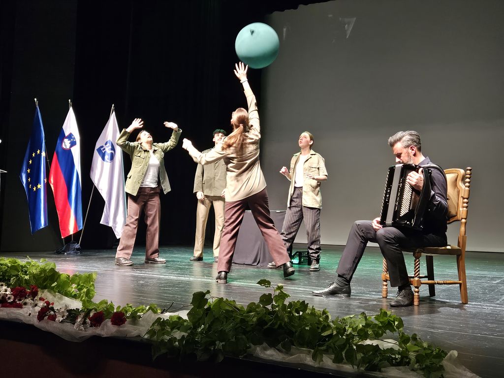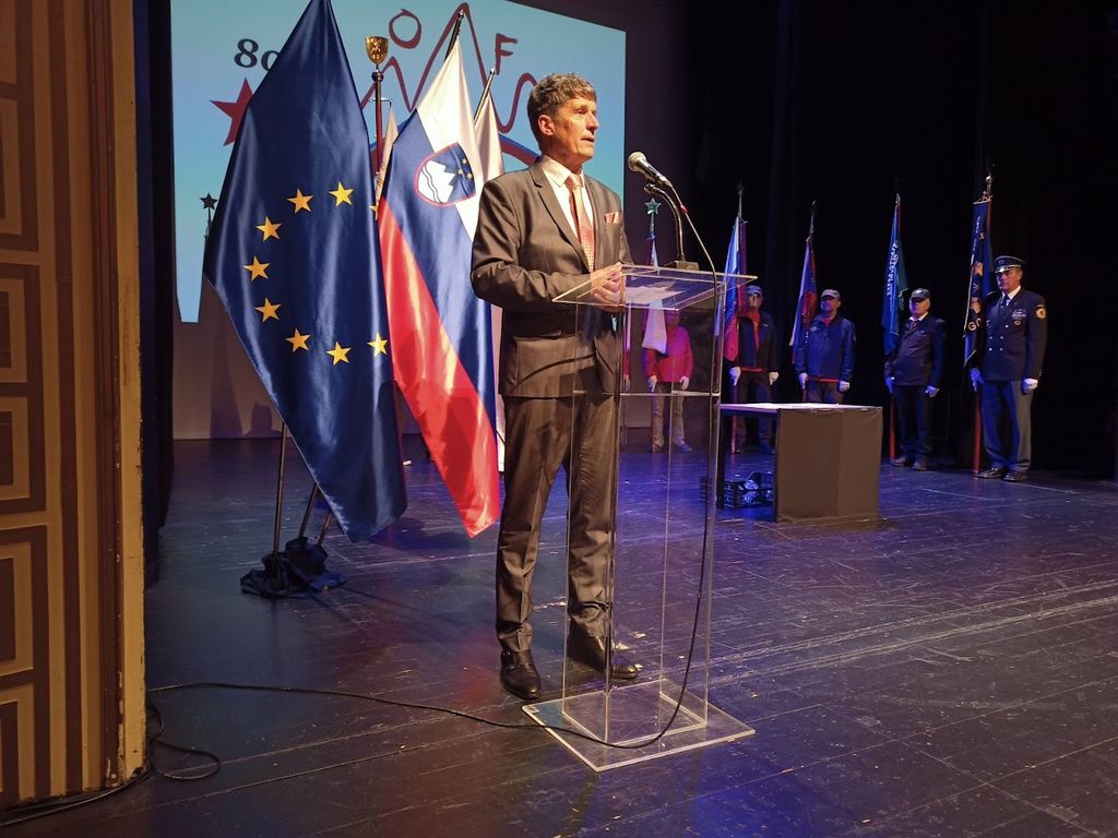Slovesnost se je nadaljevala v dvorani Gledališča Toneta Čufarja. Udeležili so se je visoki gostje: minister za obrambo Republike Slovenije mag. Borut Sajovic, poslanka v Državnem zboru Katarina Štravs, podpredsednik Zveze združenj za vrednote NOB Slovenije Ivan Svetlik, predstavniki borčevskih organizacij ter številni občani in občanke. V pozdravnem govoru je župan mag. Peter Bohinec poudaril: »Danes se poklanjamo pogumu, žrtvam in neizmerni volji vseh tistih, ki so se pred osmimi desetletji zoperstavili nasilju, zatiranju in ideologiji sovraštva. Zmaga nad fašizmom ni bila le vojaška zmaga — bila je zmaga vrednot: svobode, enakosti, človečnosti. Naša dolžnost je, da ohranimo spomin na preteklost, saj brez nje ni prihodnosti. Mlajšim generacijam moramo prenesti resnico o tem, zakaj so bile žrtve potrebne in zakaj mir ter svoboda nikoli ne smeta biti samoumevna. Ob tej obletnici se zahvaljujem vsem, ki skrbite, da duh odpora in ponosa živi še danes — v naših muzejih, kulturnih društvih, spomenikih, šolah in v srcih ljudi. Naj bo današnji dan ne le spomin, temveč tudi opomin, da vrednote antifašizma ostajajo temelj naše družbe.«