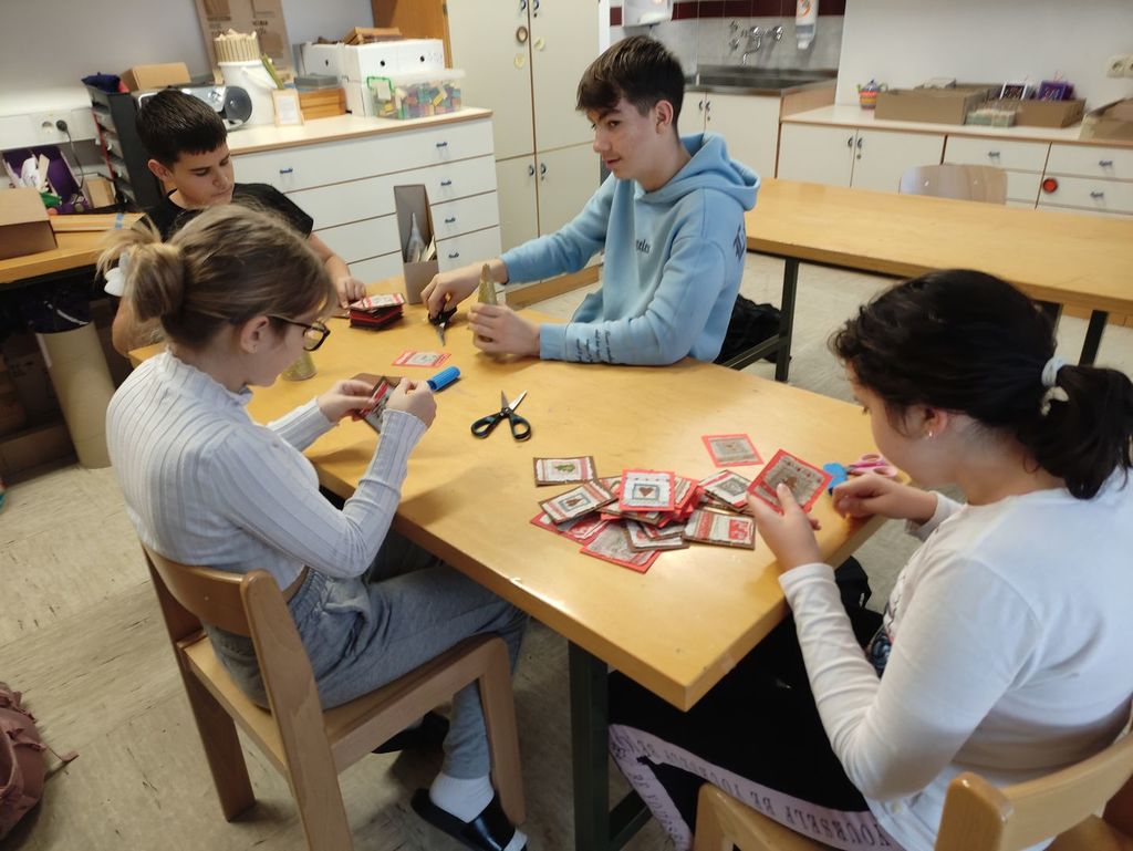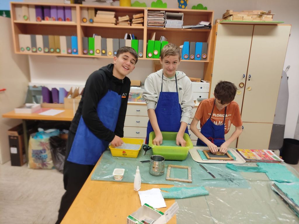 "Najprej smo reciklirali papir. To pomeni, da smo iz starega papirja izdelali novega. Nato smo na ročno izdelan papir prilepili sličice iz papirnatih serviet in jih ovili z zlato nitko,"