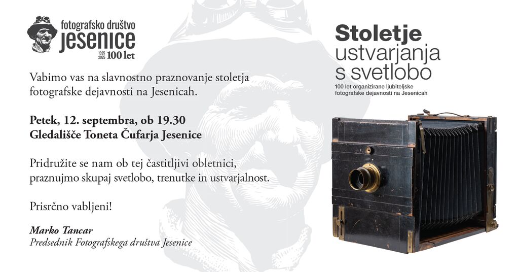 Z velikim veseljem vas vabimo, da se nam pridružite pri praznovanju častitljive 100. obletnice začetka ljubiteljske fotografske dejavnosti na Jesenicah. Osrednja slovesnost bo potekala v petek, 12. septembra, ob 19.30 v Gledališču Toneta Čufarja.