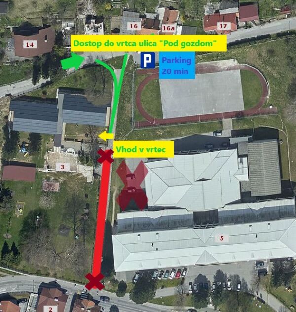 - Za starše in skrbnike so na voljo parkirišča na ulici Pod gozdom, nasproti hiš 16, 16a, kjer velja 20-minutna omejitev parkiranja za kratek dovoz otrok.