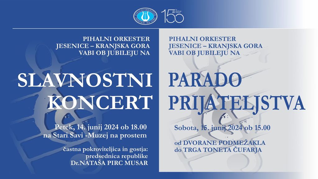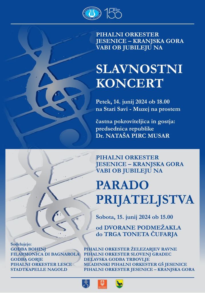 Obveščajo vas, da bo ob 150 – letnici ustanovitve Pihalnega orkestra Jesenice – Kranjska Gora v soboto 15. 6. 2024 v času od 15.00 do 17.30 potekala slavnostna parada desetih godb skozi mesto Jesenice z zaključkom na trgu Toneta Čufarja. Organizator prireditve je Pihalni orkester Jesenice – Kranjska Gora.