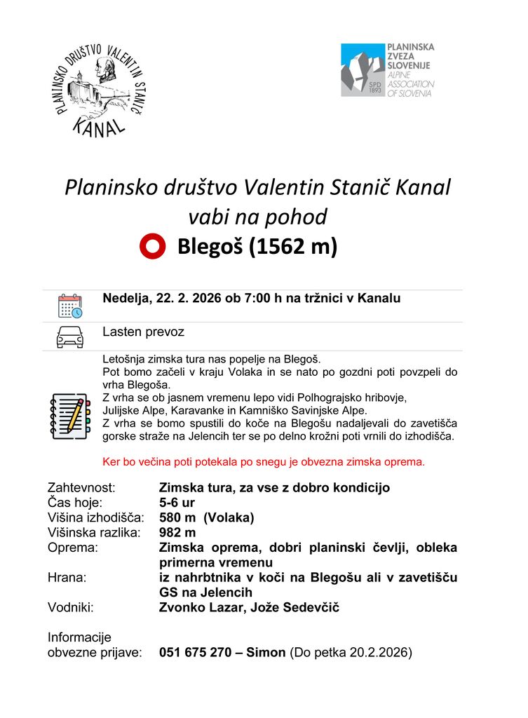 Organizator: PLANINSKO DRUŠTVO VALENTIN STANIČ
