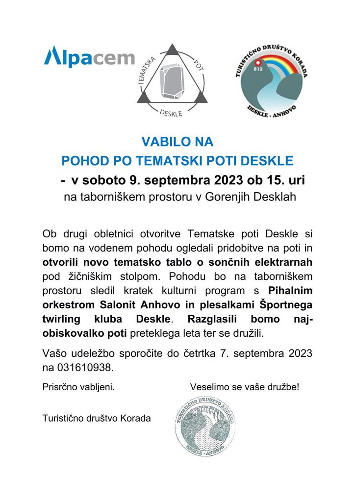Organizator: TURISTIČNO DRUŠTVO KORADA DESKLE - ANHOVO