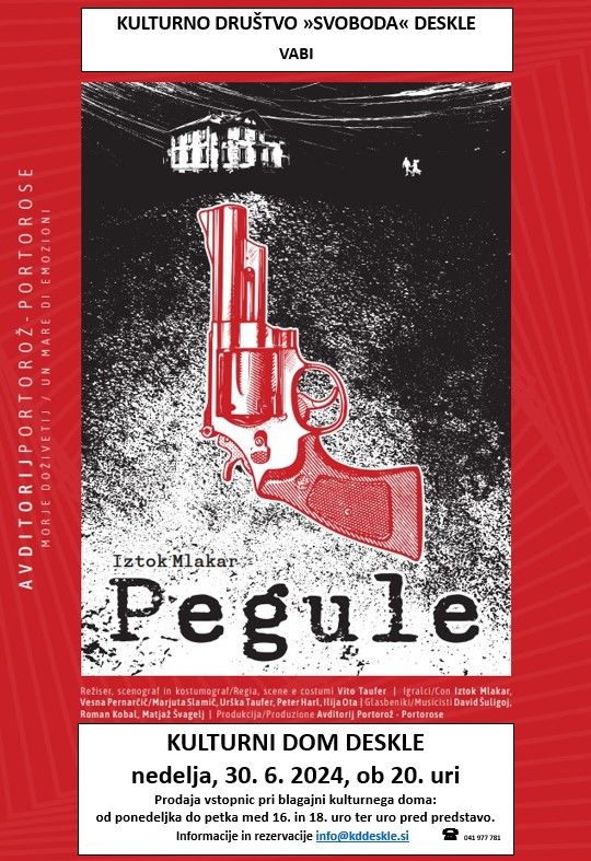 Vabljeni v nedeljo, 30. junija 2024, ob 20. uri v Kulturni dom Deskle na gledališko predstavo Iztoka Mlakarja PEGULE.