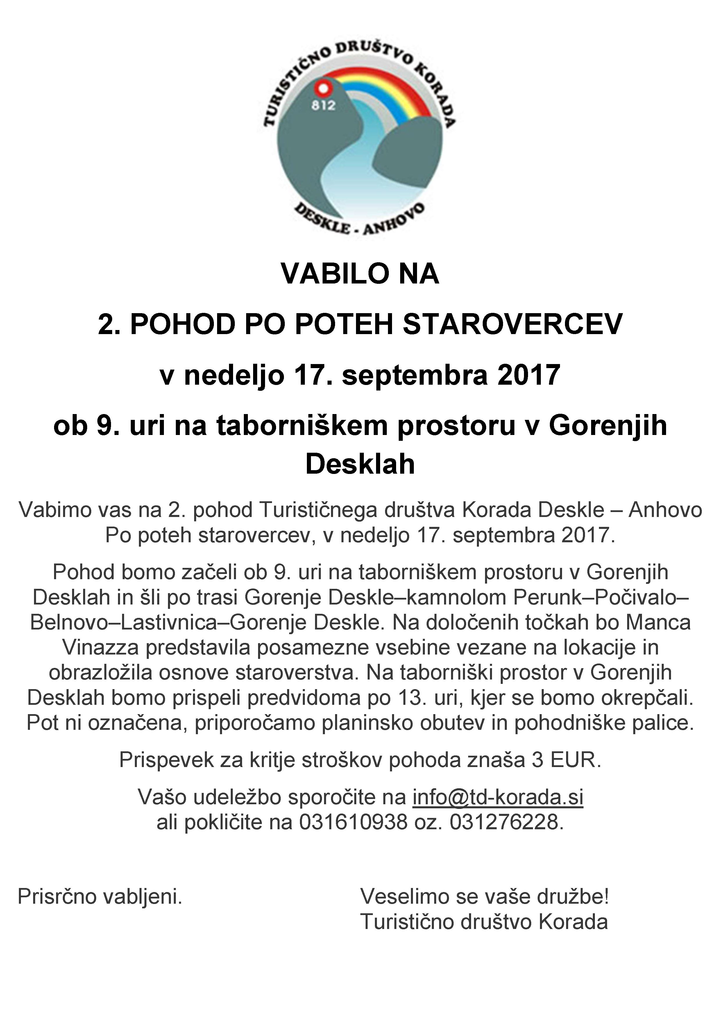 TD Korada Deskle vabi na pohod po poteh starovercev, ki bo 17.9.2017 v Desklah.