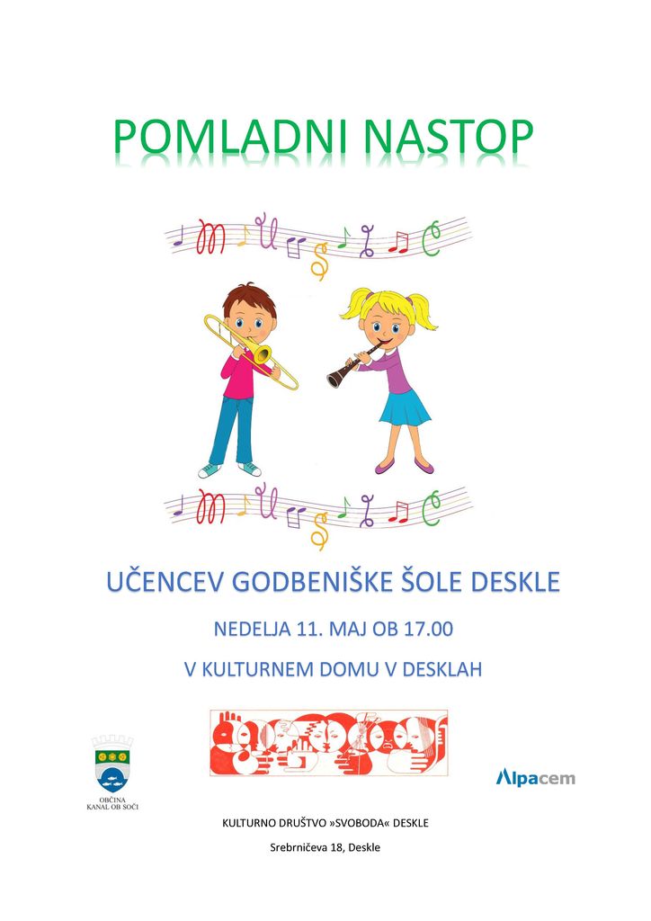 Vljudno vabljeni na letošnji Pomladni nastop, ki ga organizira Godbeniška šola Deskle. Po samostojnih nastopih naših učencev, vam bo zaigral tudi mladinski orkester.