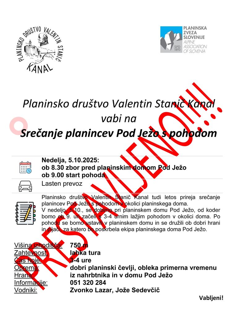 Srečanje planincev pod Ježo s pohodom - PRESTAVLJENO !