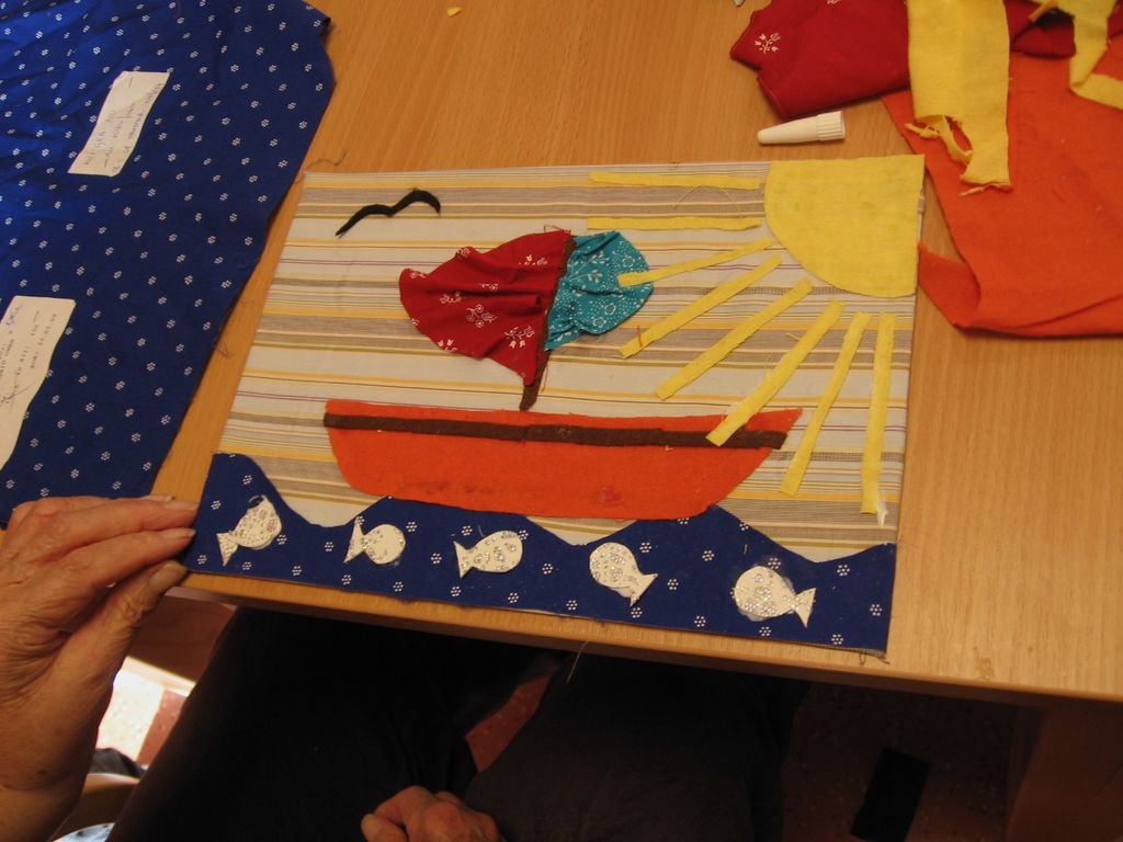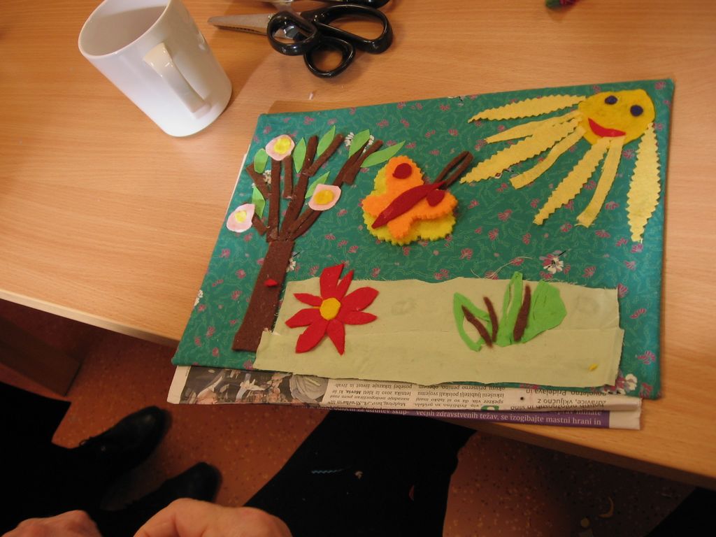 Tudi obisk Tinc je imel delovno noto. Skupno smo se namenile izdelovati kolaže iz tekstila. Pod pridnimi rokami varovank so nastajale čudovite slike pomladi, punčk, cvetočih dreves in travnikov, morja z jadrnico, ribicami in soncem, vaz polnih cvetja. Slike so izžarevale veliko ustvarjalne energije, dobre volje, svetlobe in sonca tako, kot so se zadovoljno iskrile tudi oči pridnih ustvarjalk.