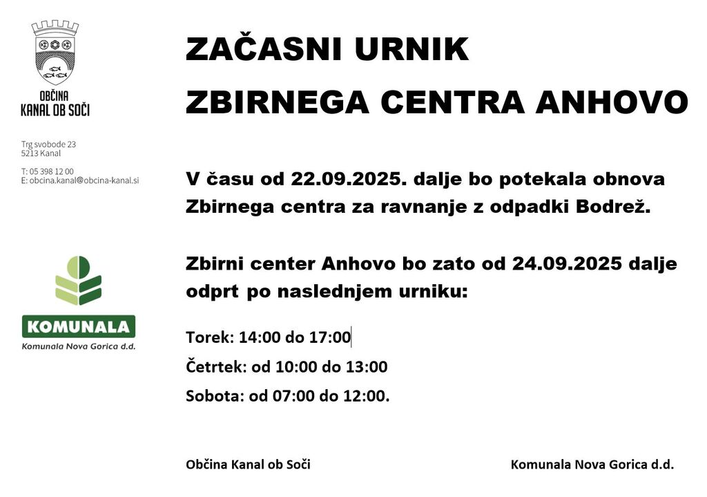 Obveščamo vas, da bo zaradi obnove zaprt zbirni center Bodrež. V tem času bo zbirni center v Anhovem obratoval po spremenjenem urniku.