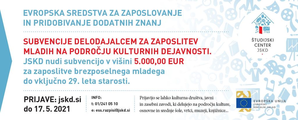 Obveščamo vas, da je objavljen nov javni razpis: PRIDOBIVANJE DODATNIH ZNANJ ZA MLADE NA PODROČJU KULTURNIH DEJAVNOSTI V OKVIRU JSKD (projekt ESS), poziv 2021/2.