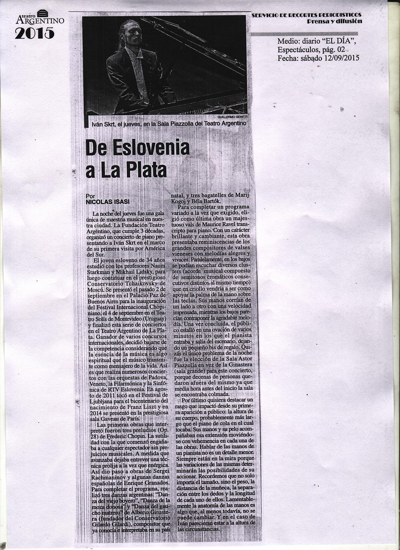Buenos Aires, 14. september 2015 – S tremi razprodanimi koncerti, dolgimi ovacijami in navdušenimi kritikami je slovenski pianist Ivan Skrt zaključil svojo prvo koncertno turnejo v Južni Ameriki. Na njej se je predstavil s svojim novim koncertom nasprotujočih se parov, treh Chopinovih in Rachmaninovih preludijev, treh španskih plesov Granadosa in argentinskih plesov Ginastere, treh Kogojevih in Bartokovih bagatel. Okronal ga je z Ravelovim valčkom La Valse, "viharnim, jasnim in kontrastnim", "redko izvajanim zaradi njegove zahtevnosti".