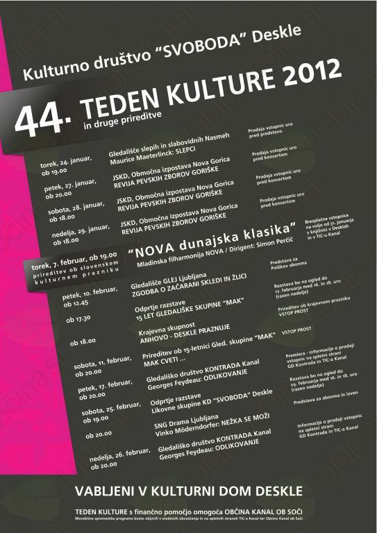 Za uvod v letošnji Teden kulture v Desklah smo gostili edino gledališče slepih in slabovidnih v Sloveniji, Nasmeh. Gledališče, tako kot mnogo drugih. V njem ustvarjajo ljubiteljski gledališčniki. Edina njihova skupna lastnost je, da ne vidijo. Mogoče so njihove predstave zaradi tega bolj občutene, kakor pravijo, mogoče pa tudi ne. V kulturnem domu v Desklah so nas v torek, 24. januarja, pričakali z nasmehom in odigrali predstavo Mauricea Maeterlincka Slepci. V predstavi je nastopal tudi nas sokrajan Darjo Vogrič, doma iz Plav.