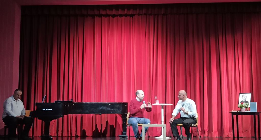 Po dobri uri trajajočem recitalu je sledil še krajši pogovor z Jankom Krištofom. Vodil ga je Dejan Valentinčič iz Globnega, velik poznavalec položaja Slovencev v zamejstvu in po svetu ter manjšin v Sloveniji, avtor več knjig, znanstvenih monografij in številnih znanstvenih, strokovnih in poljudnih člankov. V prijetnem in na trenutke humornem pogovoru smo lahko slišali, da je Koroška zibelka slovenstva, kako kulturna društva in duhovniki se trudijo ohranjati slovensko besedo, kakšno je sodelovanje in kako zelo je pomembno sodelovanje vseh krovnih organizacij. S svojimi recitali hoče vzbujati čut za lepoto slovenske besede in kako se posameznega recitala uči. Zaupal nam je, da je včasih tudi naporno in da če vztrajaš veliko zmoreš.