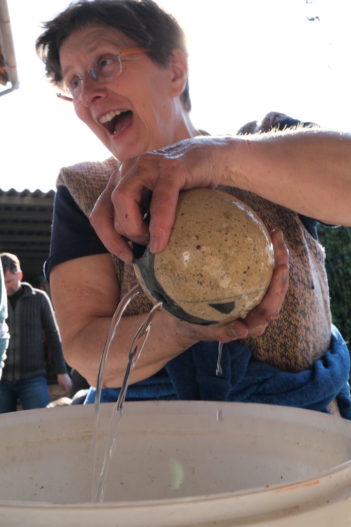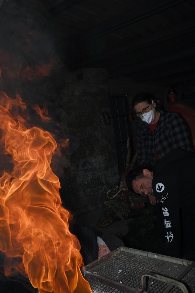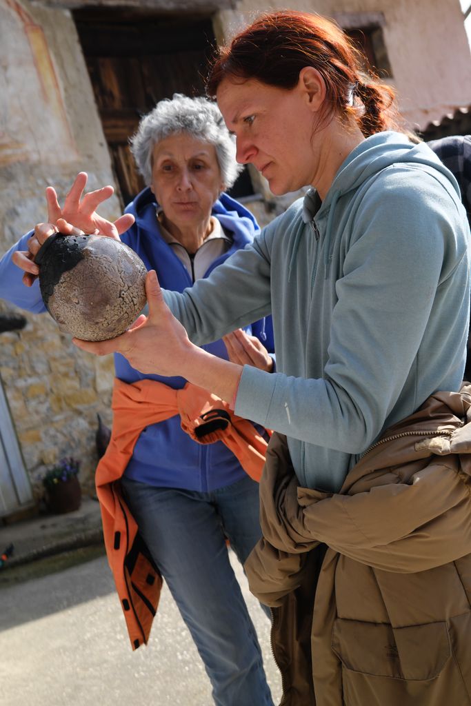 Na delavnico posebne tehnike žganja gline, imenovane ràku, so prišli. In na druženje. Sami prekaljeni mojstri. S seboj so prinesli enkrat odžgane izdelke iz šamotirane gline, Ivan Skubin, njihov gostitelj in tudi sam prekaljen mojster, jim je odstopil svoje avtorsko narejene glazure iz pepela od trt, modre galice in zemlje (prsti). Nanesli so jih na svoje izdelke, ki so jih potem skrbno položili v veliko peč za keramiko in…čakali. Samo mojstri vedo, kolikšna mora biti temperatura v peči in kdaj je tisti trenutek, ko je potrebno peč odpreti, po žareč izdelek seči s posebnimi kleščami in ga položiti v žagovino. Tam dozoreva lepota njegovega arhaičnega otipa – in potem, po približno pol ure, zagledajo oči tisto, kar so ustvarili vsi štirje elementi: zemlja, voda, zrak in ogenj.