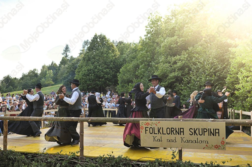 In veselje zbranih ljudi je takoj pokazalo, kako lepo je bilo videti našo folklorno skupino Kal nad Kanalom, ki je v »tahmašnih oblekah« zaplesala na takem plesnem odru sredi narave in ob spremljavi domačih godcev "Trio nikoli mlajši".