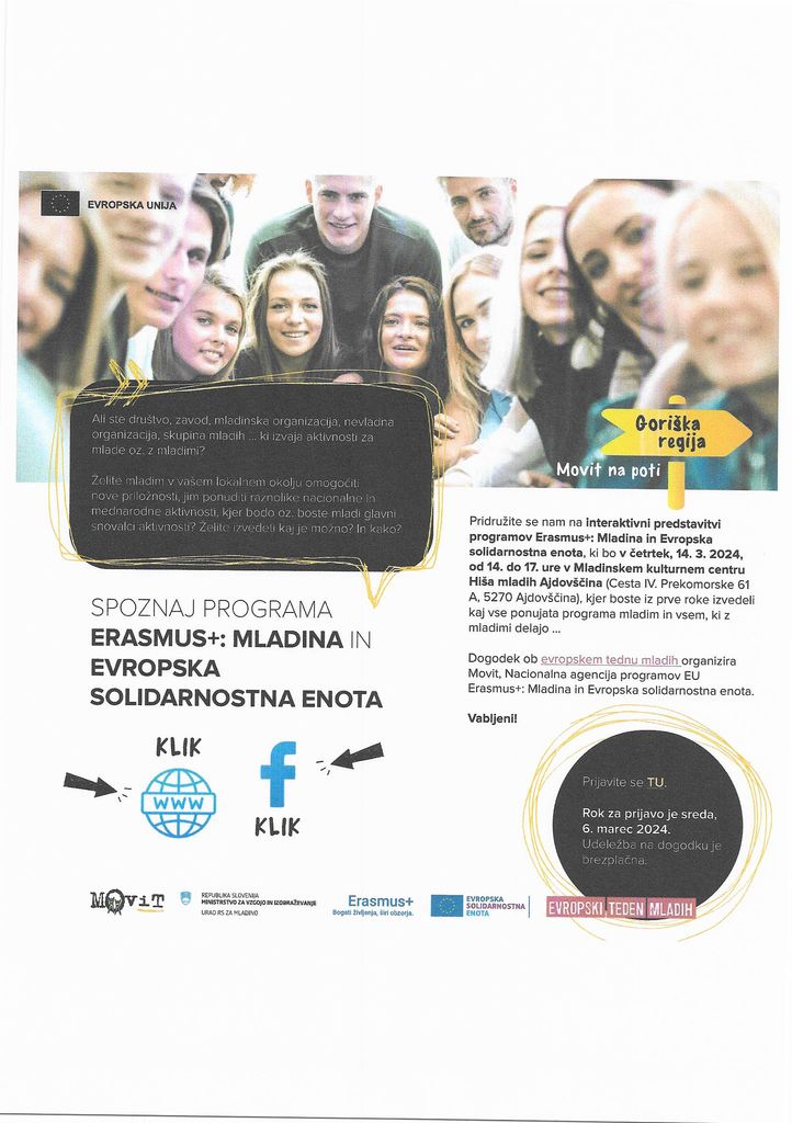 Vabimo vas na interaktivno predstavitev programov Erasmus+: Mladina in Evropska solidarnostna enota, ki bo v četrtek, 14. 3. 2024, od 14. do 17. ure v Mladinskem kulturnem centru Hiša mladih Ajdovščina (Cesta IV. Prekomorske 61 A, 5270 Ajdovščina).