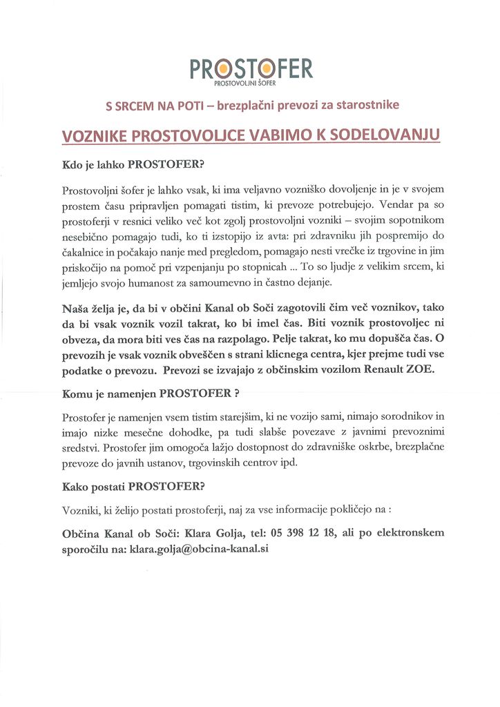 Vozniki, ki želijo postati prostoferji, naj za vse informacije pokličejo na Občina Kanal ob Soči: Klara Golja, tel: 05 398 12 18, ali po elektronskem sporočilu na: klara.golja@obcina-kanal.si