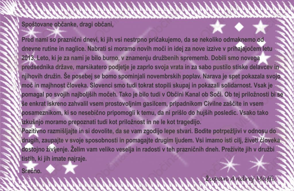 Leto, ki je za nami je bilo burno, v znamenju družbenih sprememb. Dobili smo novega predsednika države, marsikatero podjetje je zaprlo svoja vrata in za sabo pustilo stiske delavcev in njihovih družin. Še posebej se bomo spominjali novembrskih poplav. Narava je spet pokazala svojo moč in majhnost človeka. Slovenci smo tudi tokrat stopili skupaj in pokazali solidarnost. Vsak je pomagal po svojih najboljših močeh. Tako je bilo tudi v Občini Kanal ob Soči. Ob tej priložnosti bi se še enkrat iskreno zahvalil vsem prostovoljnim gasilcem, pripadnikom Civilne zaščite in vsem posameznikom, ki so nesebično pripomogli k temu, da ni prišlo do hujših posledic. Vsako tako izkušnjo moramo prepoznati tudi kot priložnost in ne le kot tragedijo.
