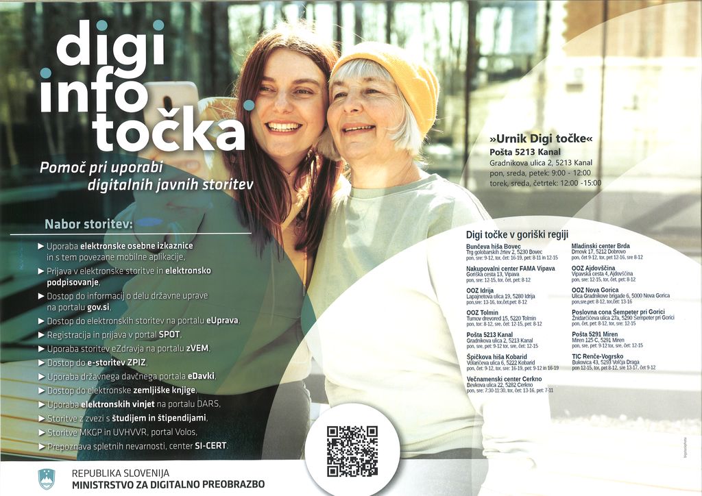 "Digi info točka"- Pomoč pri uporabi digitalnih javnih storitev, tudi na Pošti v Kanalu po naslednjem urniku: