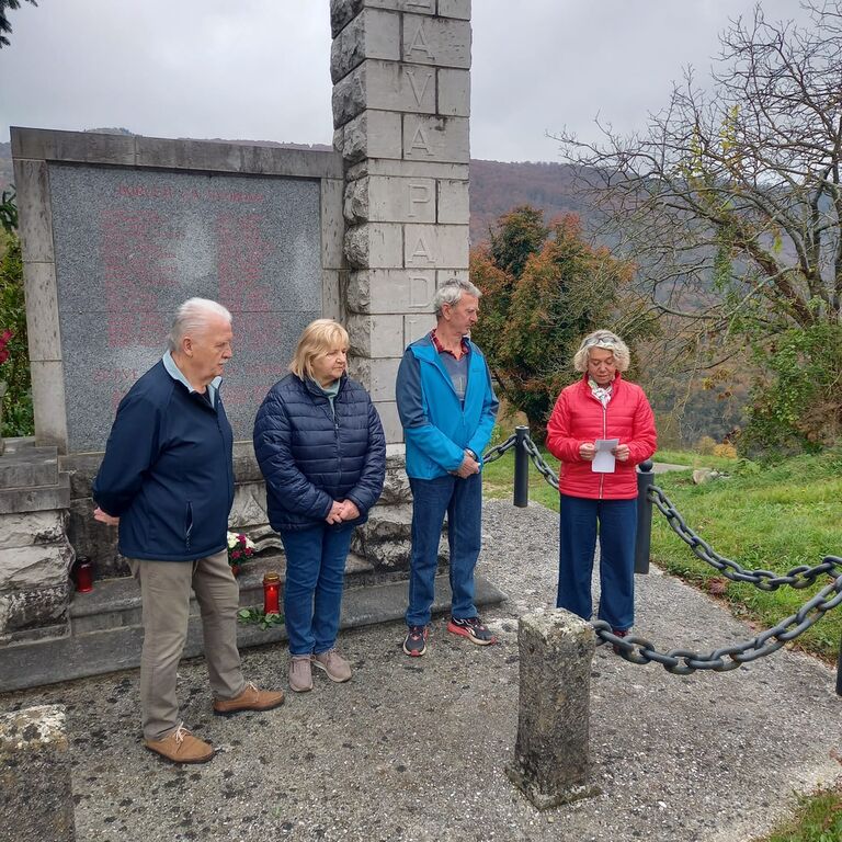 V oktobru lanskega leta pa smo se dogovorili, da obiščemo zgodovinska obeležja v naši občini. Z avti smo se iz Kanala zapeljali do Avč, kjer smo se ustavili sredi vasi ob spomeniku NOB, prižgali svečko, prebrali pesem in se poklonili padlim. Ob spomeniku nas je pričakala predstavnica KS Avče, ki nas je pospremila do hiše, na kateri je spominska plošča aktivistu Mihaelu Presenu, sodniku Narodnega sodišča za severno-primorsko okrožje.