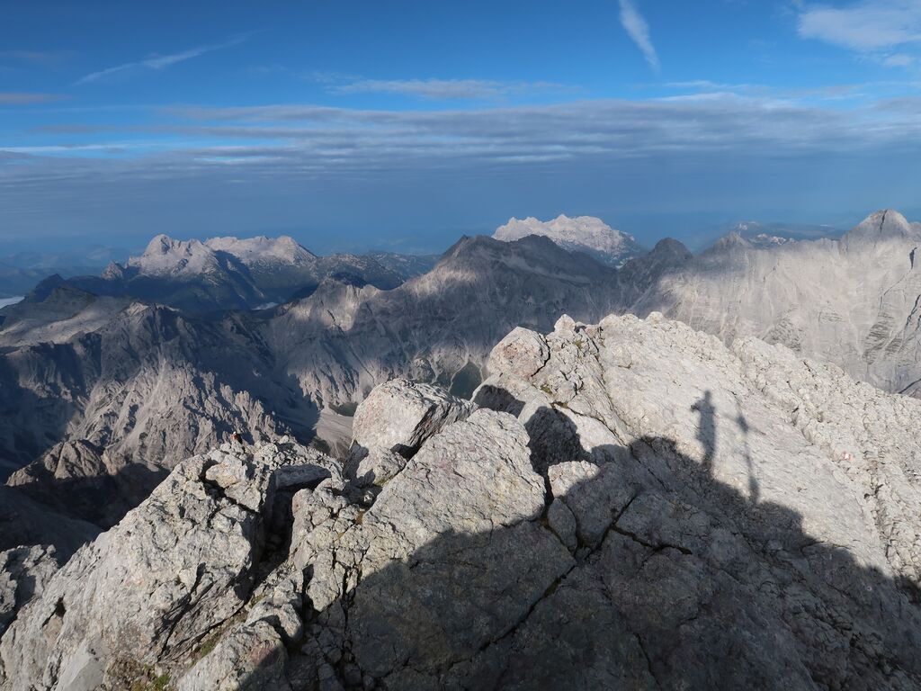 Na vrhu Mittelspitze smo si seveda čestitali in se obvezno fotografirali. Zaradi malo prostora, o katerem piše tudi Stanič, smo imeli kar nekaj težav, da smo vseh 20 planincev stisnili okoli križa, ki tudi tu, kakor na Hochecku, označuje vrh. Poleg zadovoljivo dobrih nog in rok je bil naš zaveznik tudi vreme, ki se je razmeroma lepo naredilo in dan je bil za tovrstne dogodivščine pravzaprav zelo primeren, jesenske temperature so pomenile, da od čel ni preveč kapljalo, oblaki pa so se ravno toliko razmaknili, da so pokazali tudi zaplate modrega neba.