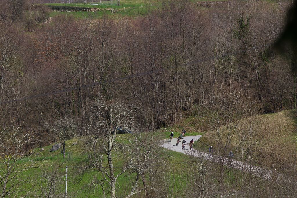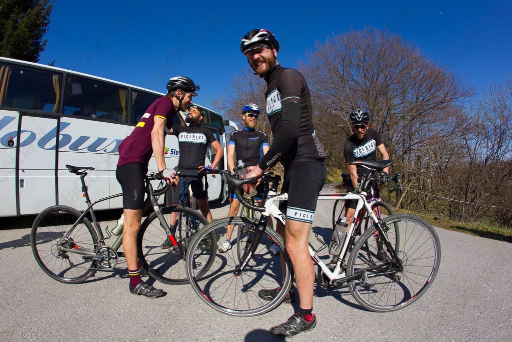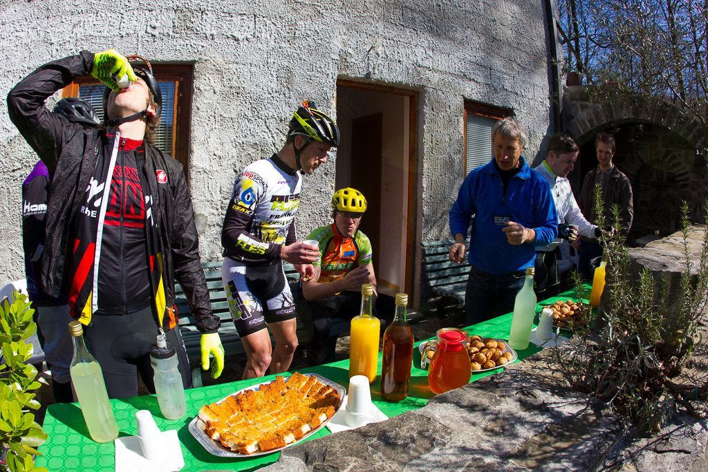 Štartali smo z rahlo zamudo, vendar vse v okviru urnika. Srčni utrip je bil visok že po nekaj obratih pedal, kajti vedeli smo, da nas že po nekaj kilometrih čaka prvi šesto-meterski šprint. Šele danes, ko sem si v mislih lahko skupaj sestavil celotno dogajanje včerajšnjega dne, sem doumel kako briljanten koncept je imel dogodek. Vmesni sprinti, napadi na vzponih, pobegi na “lumpy” odsekih, bilo je kot na kateri izmed etap na tritedenskih dirkah. Na trasi je bilo devet segmentov razdeljenih v tri kategorije: Sprinti (2), Vzponi (4) in Ovinki (3). “Šusi”, kot jih je poimenoval organizator Miha, so bili strateško postavljeni, tako, da smo do začetne točke posameznih tekmovalnih odsekov največkrat prispeli že močno upehani. Sledil je pisk sirene glavnega sodnika na motorju in že smo bili vsi v “rdečem”. Čisto drugačna dimenzija kot na treningu. Začne se narekovanje tempa, bojuješ se s samim sabo, da bi nekako “držal” tekmovalca pred seboj, potihem upaš, da ga boš pred ciljno črto mogoče celo poskusil prehiteti, gledaš visoke številke na merilcu utripa, ki se še zvišajo, ko se obrneš nazaj in vidiš, da se ti je nekdo pripeljal na gumo. Preplet trpljenja, brezupnih poskusov regeneracije pred naslednjim “šusom” in dih jemajočih razgledov na zasnežene okoliške vrhove. Vse to v osemdesetih kilometrih z dvema “feedzone-oma”, na katerih ti ultra-gostoljubni domačini ponujajo lokalne dobrote.
