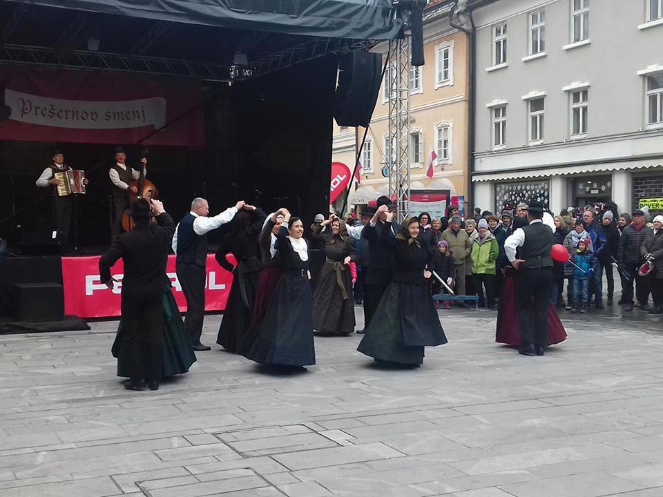 Prešernov smenj, ki oživi spomin na 19. stoletje in našega največjega pesnika, je ena od najprepoznavnejših slovenskih prireditev ob kulturnem prazniku. Letos se je 8. februarja na ulicah Kranja odvijal že petnajsti sejem domače in umetnostne obrti. Utrip trgov so zaznamovali pevski zbori in recitacije Prešernovih pesmi. Nostalgične melodije lajnarjev in topot konjskih vpreg s kočijami so obiskovalce hudomušno spominjali na romantično stoletje. Mestni tlak je s plesi obarvalo več folklornih skupin iz različnih krajev Slovenije. »Tahmašne gvante« smo oblekli tudi kalski folklorniki in se ob spremljavi godcev Nikoli mlajši ponosno zavrteli v starem mestnem jedru ter dodali kamenček izročila Banjške planote v veličasten kulturni mozaik.