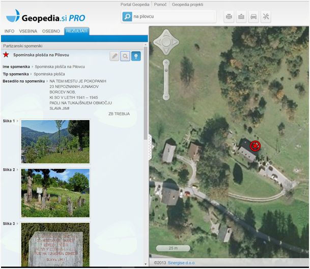 Trenutno je vpisanih 1700 spomenikov, pa to najbrž ni niti polovica vseh. Državni Register nepremične kulturne dediščine pozna izbor okrog 2600 partizanskih obeležij, vendar brez fotografij in brez besedil na njih. Zbirko na Geopediji lahko dopolnjuje kdor koli, samo registrirati se mora prej. Nič se bat, če pomotoma naredi kaj narobe, za njim popravim. Zbirko sva pred leti zastavila z ženo, da bi vanjo vpisovala spomenike iz svoje okolice in s kolesarskih ter planinskih izletov (nekaj koristnega pač mora početi človek), pridružili so se prijatelji, študenti zgodovine in posamezni člani Zveze borcev. Najprej sva popisovala kar vse, potem pa sva se omejila na partizanske, saj so tisti za prvo svetovno vojno in domobranski že lepo popisani. Zbirka je zgled, kako lahko od spodaj navzgor, brez denarja, zgolj s sodelovanjem zavzetih posameznikov nastajajo velike in lepe reči. Popisovanje spominja na lov na zaklade (geolov oz. geocaching), s to razliko, da tu ne dobimo geografskih koordinat iskanega predmeta, ampak smo mi tisti, ki zaznamujemo lokacijo spomenika na zemljevidu, potem ko ga najdemo. Iskanje spomenikov kje v gozdu in v hribovitem svetu brez pravih poti zna biti prav pustolovsko.