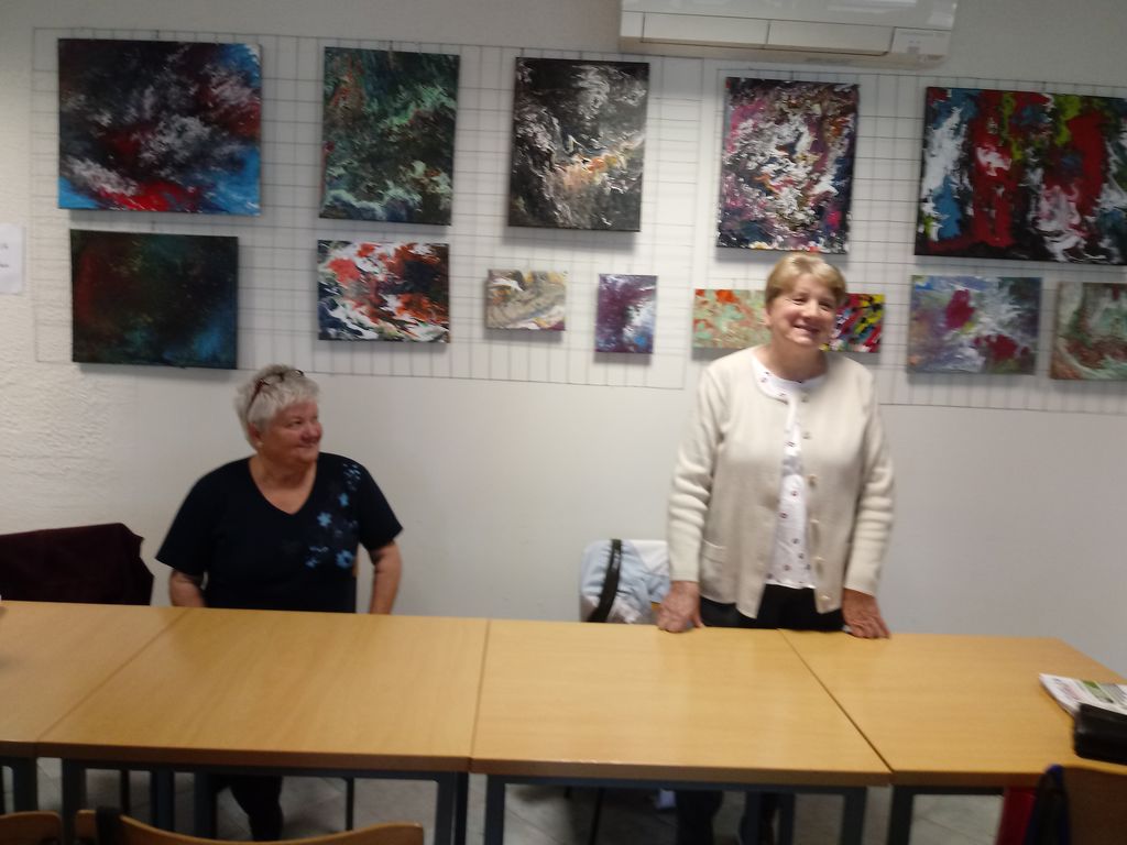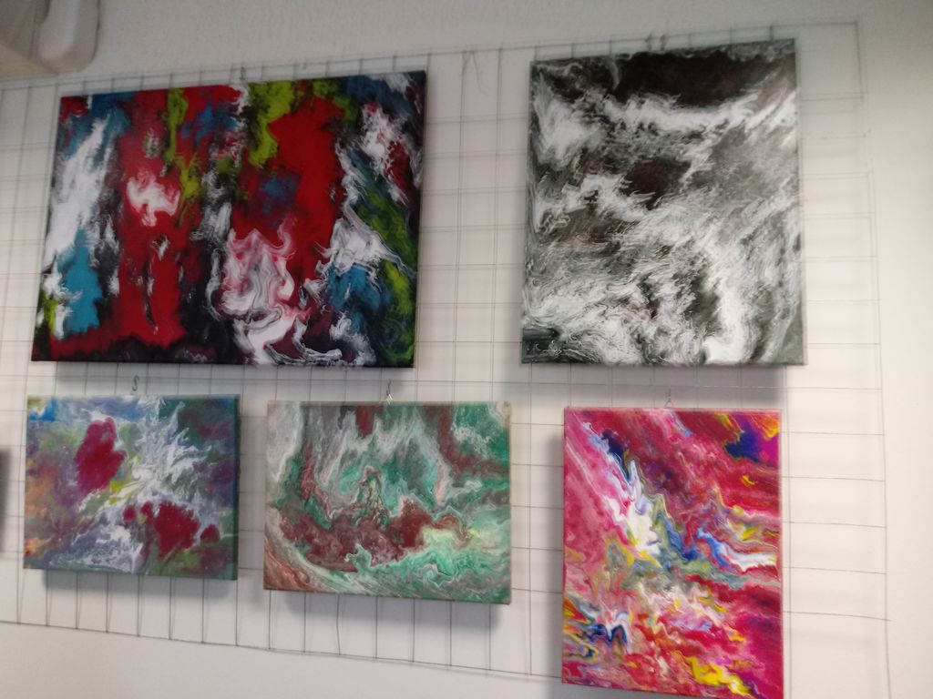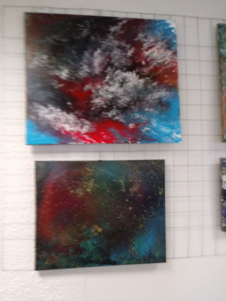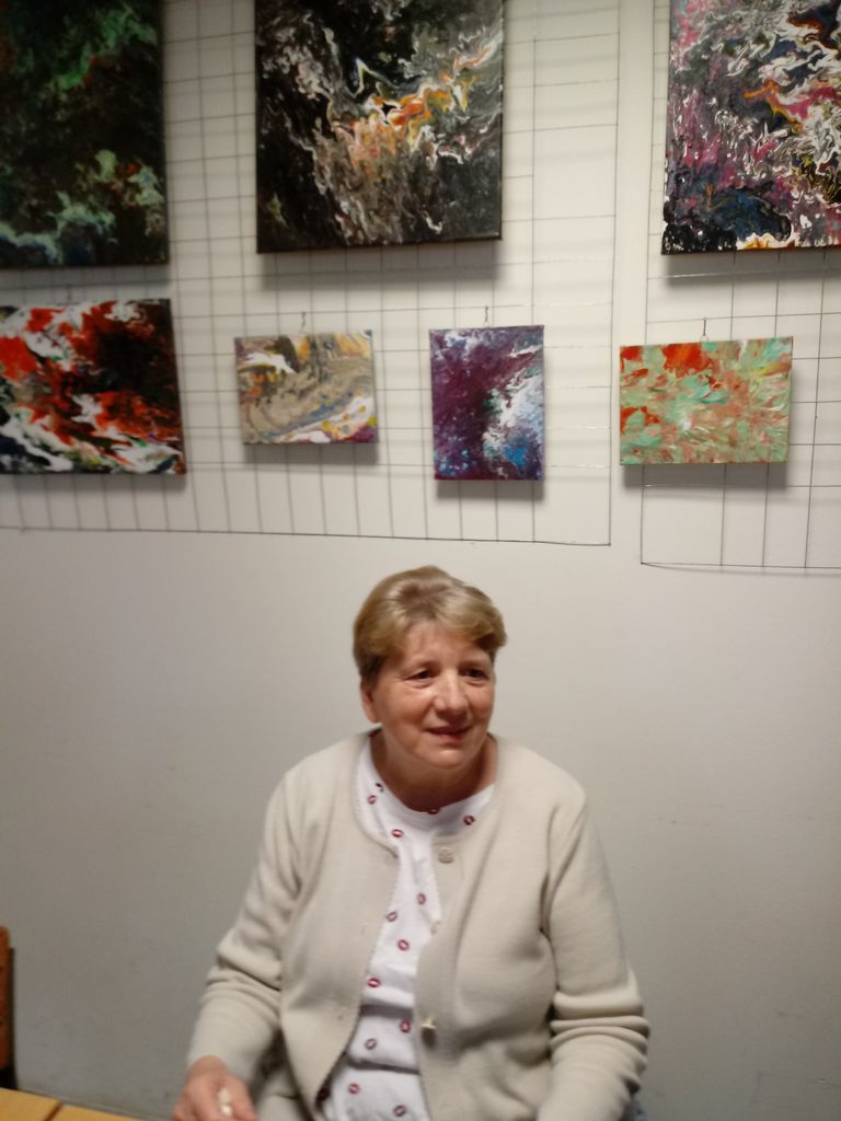 Pri tokratnem srečanju se nam je s svojimi deli predstavila ljubiteljska slikarka Bogdana Pintar, ki je tudi sicer redna obiskovalka centra. S slikanjem se ukvarja že dolgo in domače so ji različne tehnike slikanja. Toda v času izolacije zaradi korona epidemije je našla nov izziv in sicer v tehniki acryl fluid oziroma dirty pour, kar bi lahko poslovenili kot tehnika izlivanja. Rezultat je abstraktna slika. Vsak kdo si lahko predstavlja svoje videnje, lahko je to nočno nebo, posuto z zvezdami, vesolje, morski valovi in še in še. Tehnika se zdi na prvi pogled zelo preprosta. Loti se je lahko vsak, četudi ni talentiran umetnik in četudi nima posebnih risarskih spretnosti. Toda, da je rezultat tudi umetniški, je potrebnega kar precej znanja, zlasti o pravilnem mešanju barv. Od prave kombinacije le-teh je odvisno, ali bo nastala umetnina ali le brezizrazna packarija.