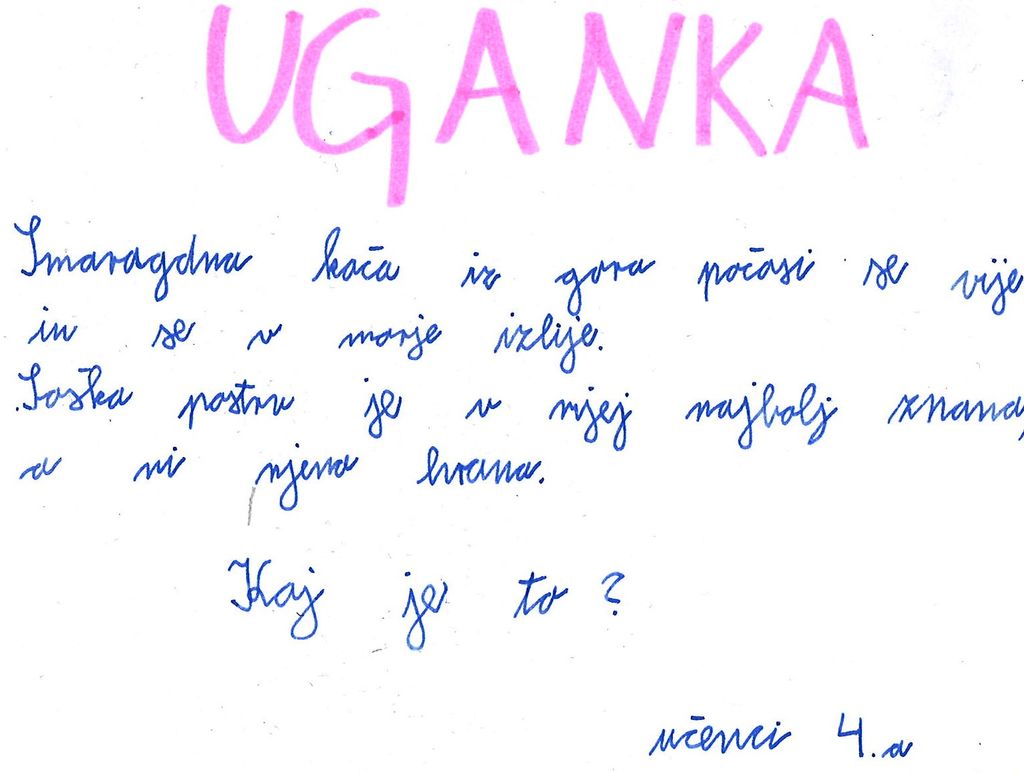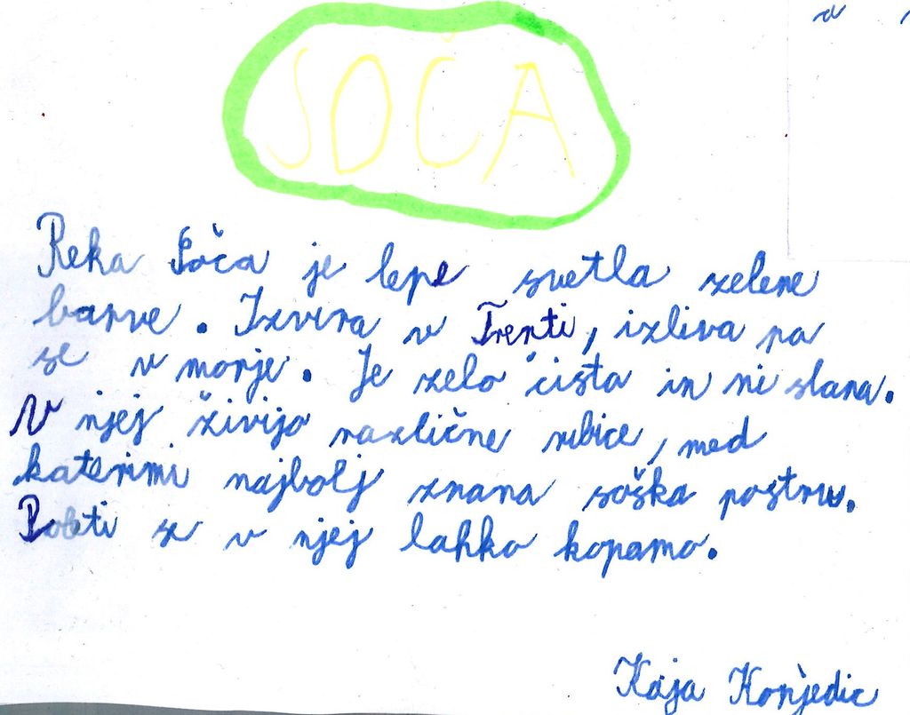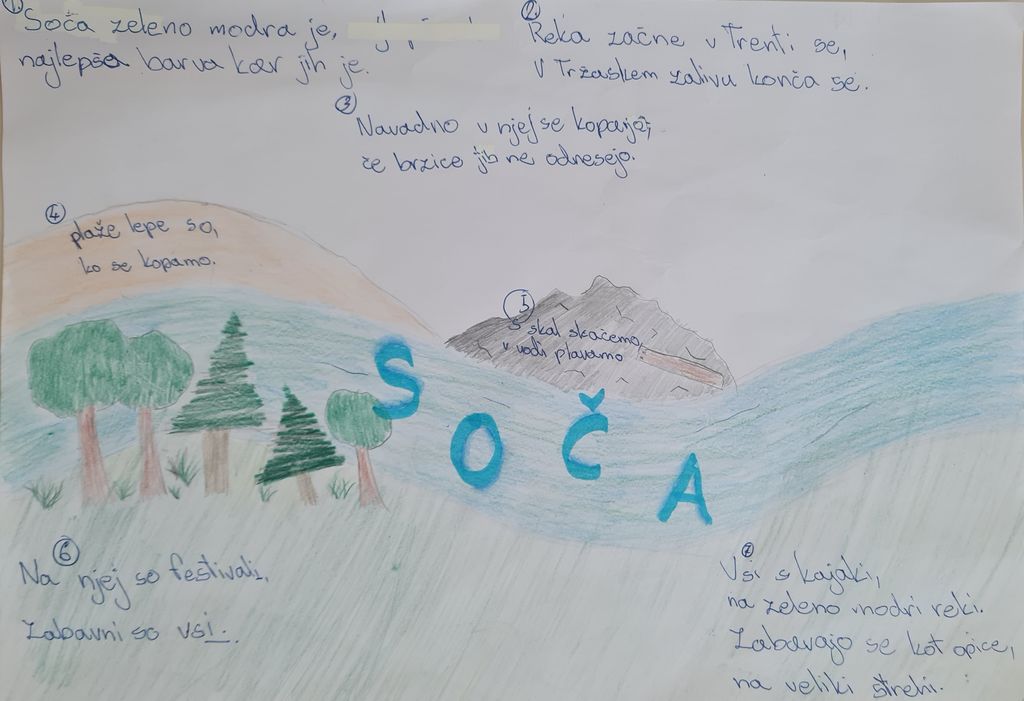 Sledilo je še poustvarjanje na temo reke Soče, pri čemer je nastalo kar nekaj zanimivih del – pesmice, uganke in kratki zapisi, ki odražajo znanje in občutke o naši smaragdni lepotici, hkrati pa tudi ustvarjalnost četrtošolcev.