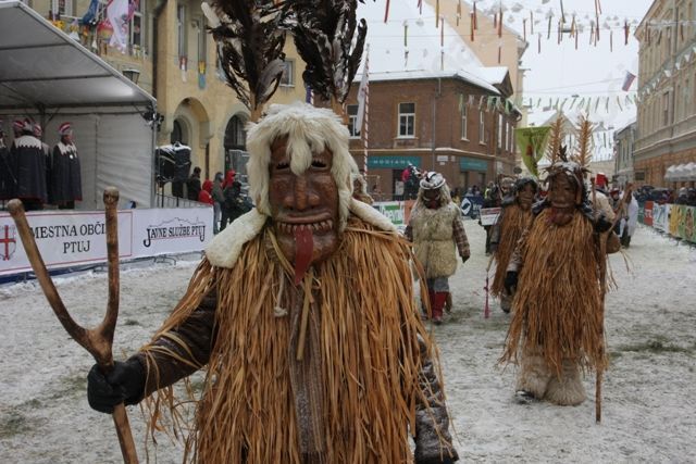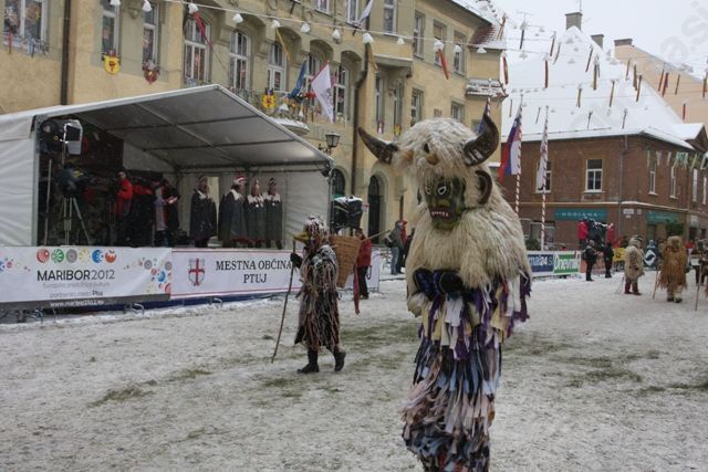 Do Ptuja so se nekateri naspali, drugi pa so bili že dobre volje in so nam krajšali čas s harmoniko, petjem in dobro voljo. Na Ptuju je zeblo še bolj, znežilo pa tudi. Maske z vseh koncev Slovenije in iz devetih držav, so se že zbirale in se glasno, kakor znajo le pusti, pripravljale na povorko. Na koncu jih je bilo več kot dva tisoč. Tudi Liški pustje so se oblekli v svoje pustne oprave, z Brankom Žnidarčičem, predsednikom Etnološkega društva LIški pustje, pa smo odhiteli na sprejem ob odprtju 52. Kurentovanja.