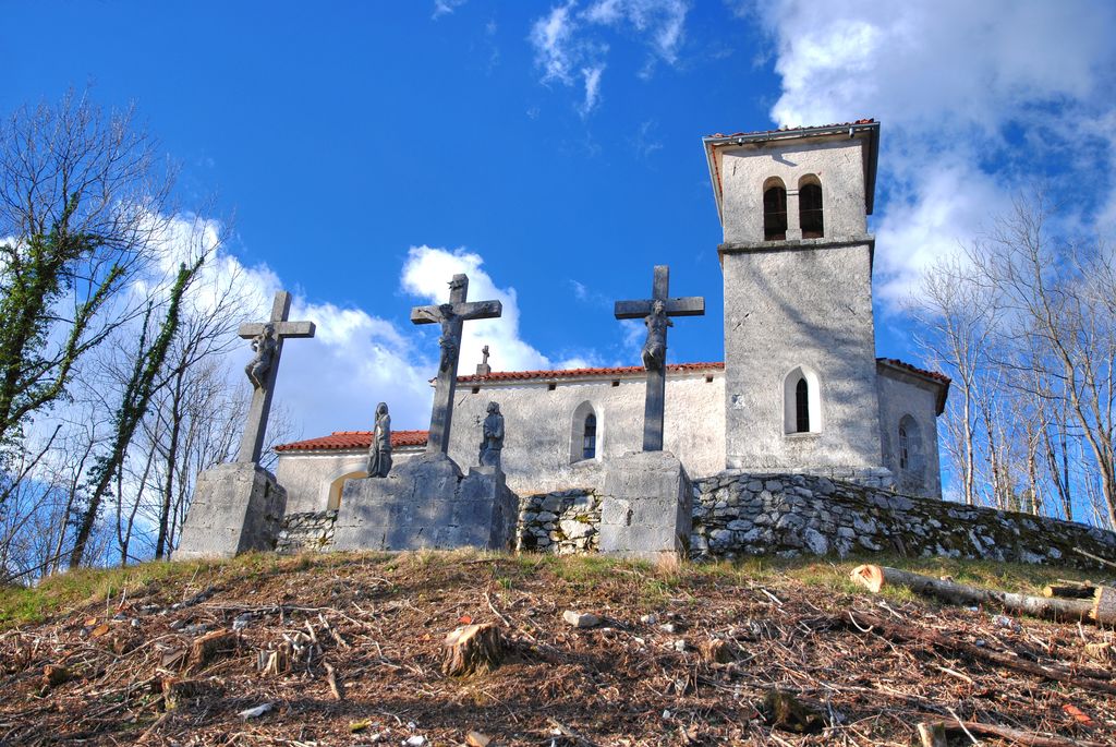 Cerkev je danes znana predvsem po kamnitem spomeniku, ki upodablja kalvarijo. Sestavljajo jo Jezus, dva razbojnika ter pod križem Jezusova mati Marija in Marija Magdalena. Ročinjska duhovnija je leta 1588 od čedajske rodbine Cottis odkupila planino Na Krasu pri Drežnici, od katere je vsako leto dobivala najemnino 15 liber sira. Leta 1709 je planino prodala in po izročilu naj bi z izkupičkom postavila spomenik. Pri dostopu s severne strani preko Prevala stoji ob cerkvi kip sv. Pavla. Na poti, ki vodi do cerkve mimo znamenj, so danes vidni ostanki treh kapelic, ki so označene že na vojaški karti s konca 18. stoletja.