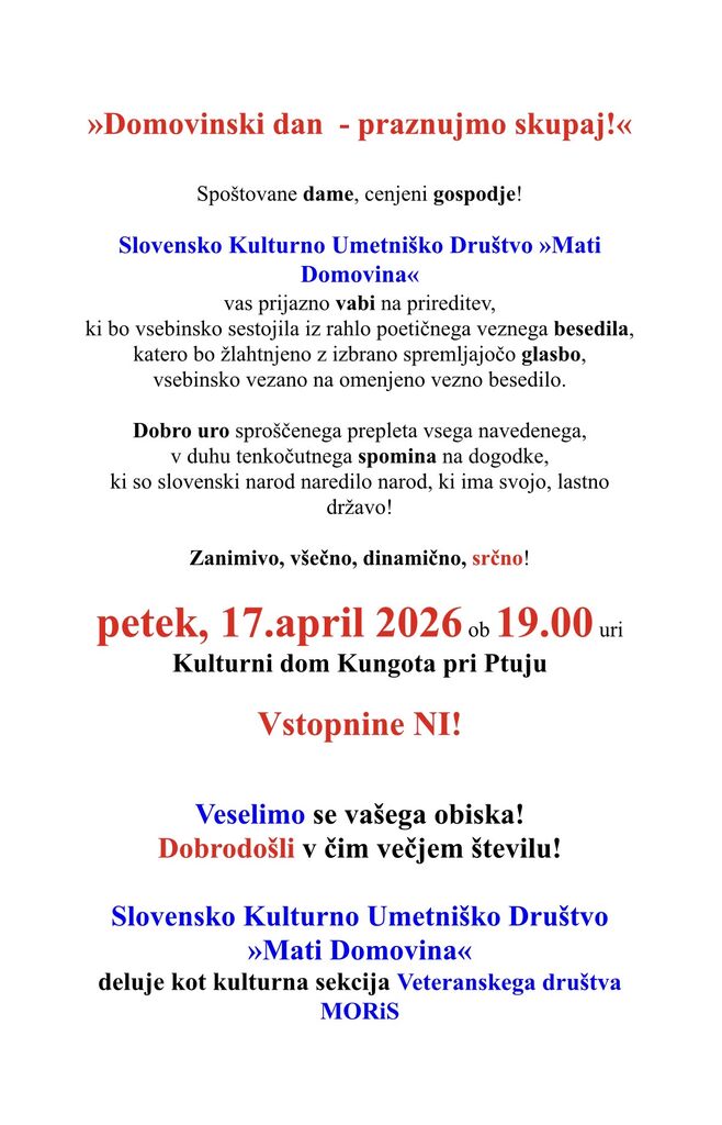 Organizator: Slovensko Kulturno Umetniško Društvo »Mati Domovina«