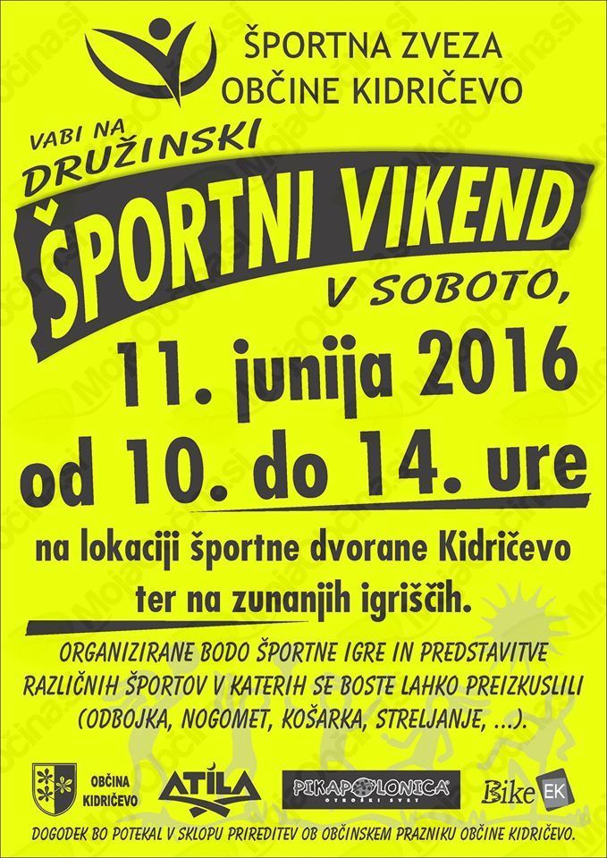 Na športnem vikendu bodo predstavljeni vsi športi ki so aktualni v občini Kidričevo. V predstavitvah športnih aktivnostih boste lahko tudi sodelovali in preizkusili svoje sposobnosti tako v: nogometu, namiznem tenisu, košarki,streljanju, odbojki itd.