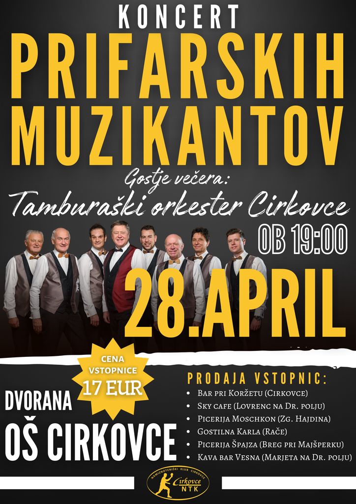 V nedeljo, 28.4.2024, se v Cirkovcah obeta nepozaben glasbeni dogodek z eno izmed najboljših koncertnih skupin v Sloveniji - PRIFARSKI MUZIKANTI!