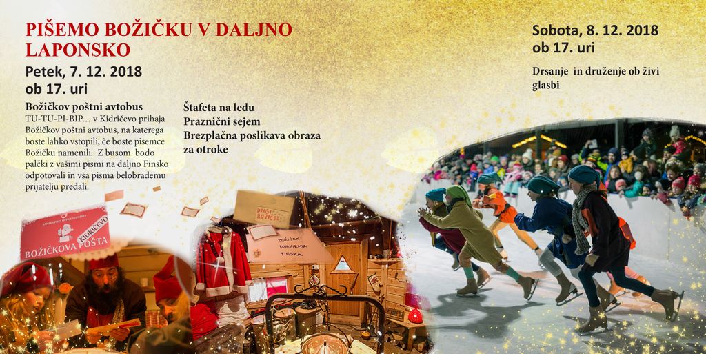 Božičkov poštni avtobusTU-TU-PI-BIP… v Kidričevo prihaja Božičkov poštni avtobus, na katerega boste lahko vstopili, če boste pisemce Božičku namenili. Z busom bodo palčki z vašimi pismi na daljno Finsko odpotovali in vsa pisma belobrademu prijatelju predali. Na drsališču bomo pripravili štafeto na ledu, v hiškah praznični sejem in brezplačno poslikavo obraza za otroke