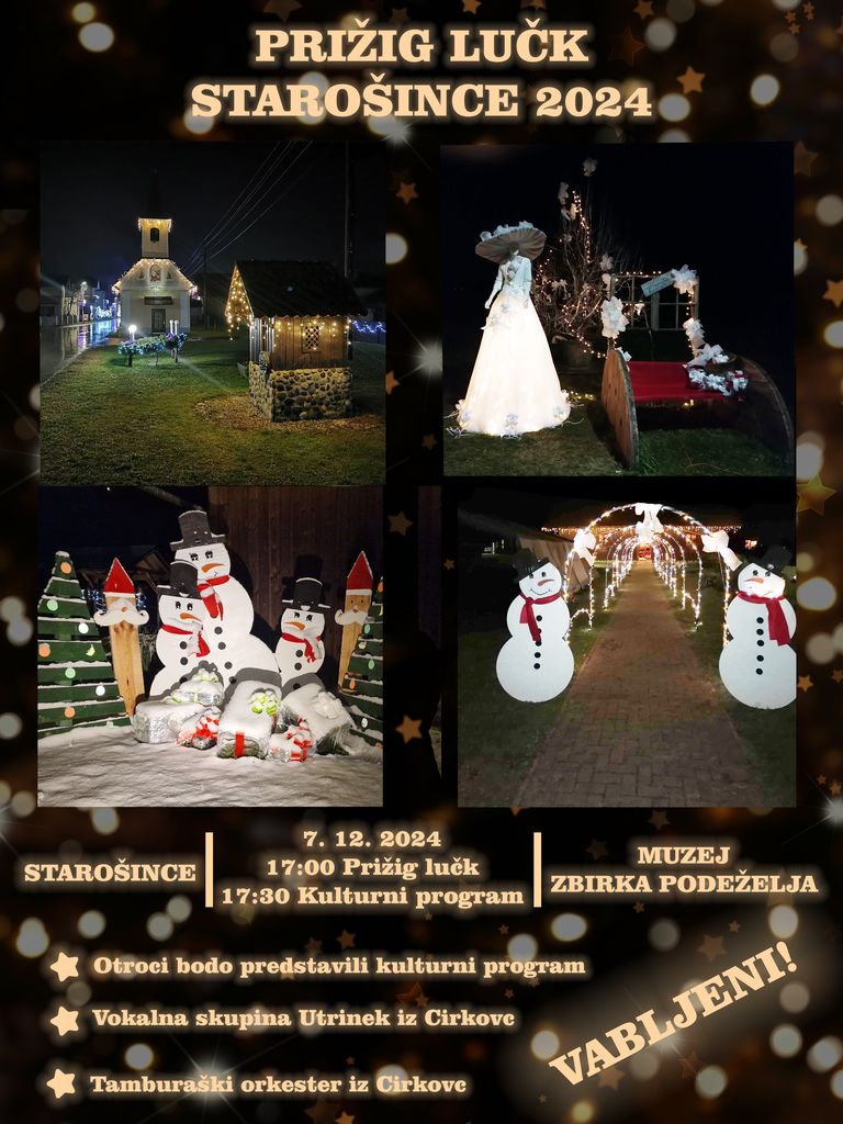 Kot že vrsto let zapored, Vas tudi letos vabimo na tradicionalen prižig lučk v Starošince. Lučke bomo v vasi prižgali v soboto 7.12.2024 ob 17.00. Po prižigu se bo ob 17.30 pričel kulturni program pri muzeju Zbirka podeželja v Starošincah. Naši malčki že pridno vadijo svoj program, ki ga bodo predstavili ta večer. Program bomo v letošnjem letu obogatili z Vokalno skupino Utrinek iz Cirkovc pod vodstvom Luke Gojkoška, ki nam bo zapela nekaj adventnih pesmi. Nato bo nastopil Tamburaški orkester iz Cirkovc, ki nam bo zaigral nekaj pesmi iz njihovega bogatega repertoarja.