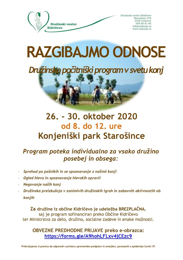 V času jesenskih počitnic zato za družine iz občine Kidričevo pripravljamo BREZPLAČEN družinski program v svetu konj, ki se izvaja v naravi, ob upoštevanju vseh omejitev - vsaka družina bo dobila svoj termin, da preprečimo morebitno srečevanje.