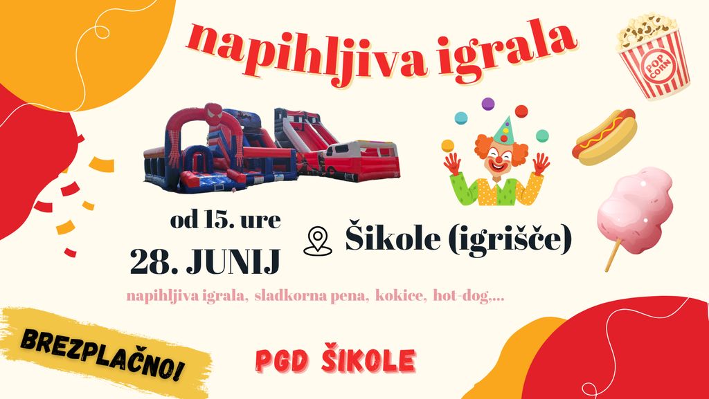 PGD Šikole vabi vse otroke na napihljiva igrala. Uporaba igral je popolnoma brezplačna, poskrbljeno bo tudi za animacijo ter za hrano in pijačo.