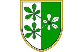 Upodobljen je na ščitu poznogotskega sloga sunitske oblike. Na črto v srebrno in zeleno razcepljenega ščita so vsajeni trije kostanjevi listi, spredaj dva in zadaj eden, predstavljeni pa so izmenično v obeh barvah grba. Zlati trak, ki ga nosi ščit na svojih zunanjih robovih, lahko služi le kot okras grba.