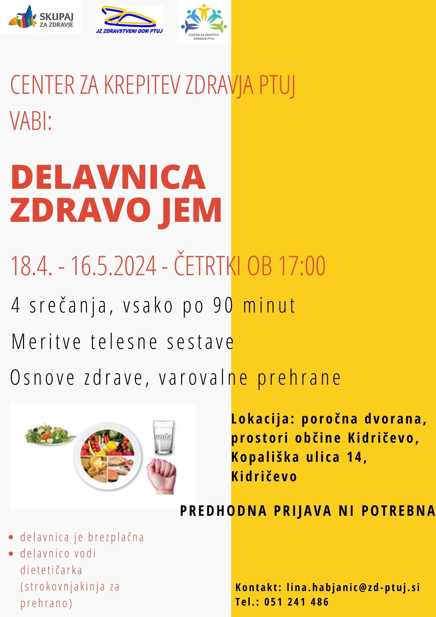 4 brezplačna srečanja " Delavnica zdravo jem". OD 18.4.2024 do 16.5.2024, ČETRTKI OB 17 URI. LOKACIJA OBČINA KIDRIČEVO - POROČNA DVORANA