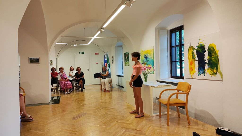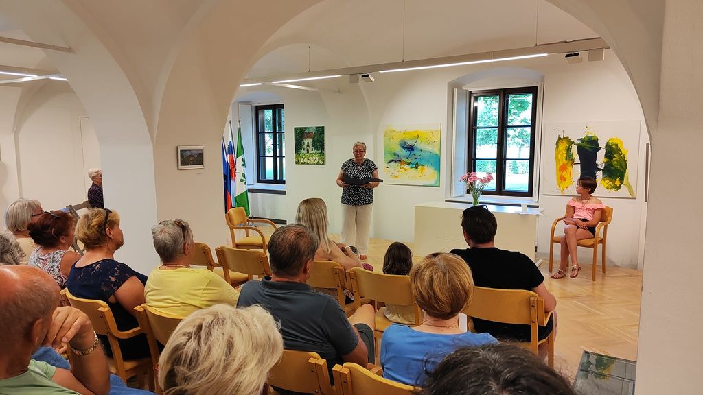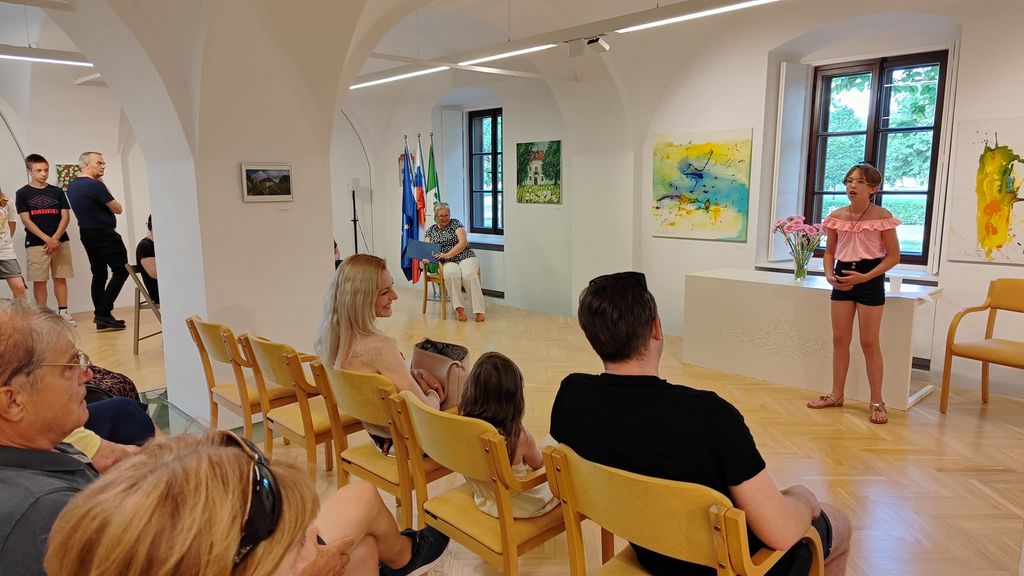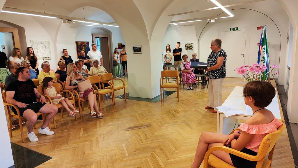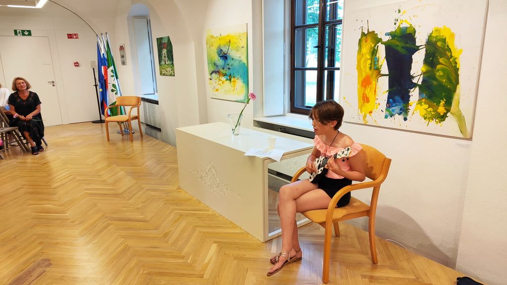 Z glasbo, petjem in igranjem na ukulele nas je v poletno, mladostniško in razigrano vzdušje na razstavi popeljala šestošolka Sara Maček.