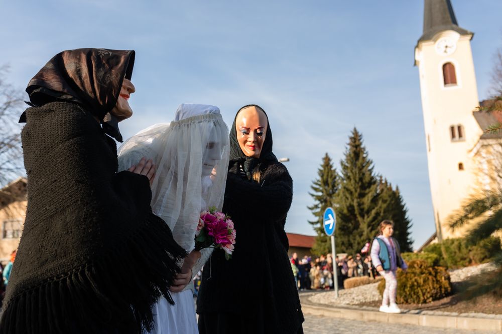 Nadaljevali smo z etnografskim delom povorke. Najstarejše dekle iz vasi, Miciko, so s slamnatim dedom Onzekom ponovno ženili domači ploharji v izvedbi FS Vinko Korže. Letos so izdali prvi folklorni videospot z naslovom Fašenska himna, ki si ga lahko ogledate na njihovi Facebook strani. Trenutno si je videospot ogledalo že več kot petnajst tisoč ljudi.