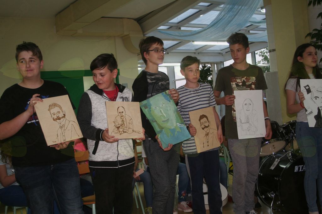 Popoldne smo začeli s filmom Pozabljeni zaklad, ki je bil posnet po knjižni predlogi Ivana Sivca. Nato pa so sledile različne »ustvarjalnice«. Učenci so pod vodstvom gospe Tatjane Novak ustvarjali Sivčeve portrete. Ker pa smo v Cankarjevem letu, so ustvarjali tudi njegovega, za nameček pa je nastalo še nekaj izvrstnih karikatur. Podobno nalogo so imeli tudi učenci pod vodstvom gospe Jožice Jurgec – ti so s pirografom ustvarjali portret na les.