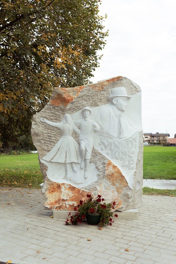 Kip je postavljen pred gostilno Korže, kjer je Vinko Korže živel in ustvarjal. Njegov pogled je usmerjen proti trgu, kot da bi še vedno spremljal življenje in kulturne dogodke v kraju, obenem pa ima večni pogled na vas, ki jo je tako močno ljubil. Kip je bil postavljen s pomočjo evropskih sredstev, sredstev društva in lokalnih donatorjev.