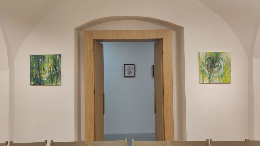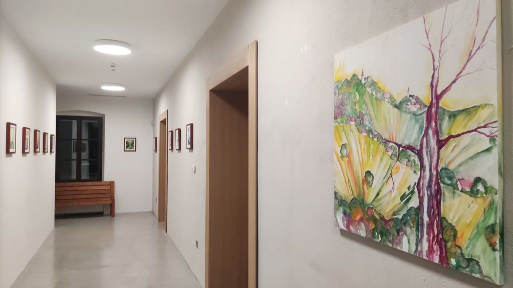 Takole avtorica razstave predstavi svoja dela: »Mogočna Donačka gora, ki bdi nad haloškim gričevjem. Valovnice, ki se zgubljajo v daljavo in dvigajo proti nebu. Drevesa, stare jablane, divje češnje ter slive, skrivljene nad strminami, se ovijajo v belino cvetja. Gozdovi zelenijo. Osamljena krajina se prebuja in drhti polna življenja.«