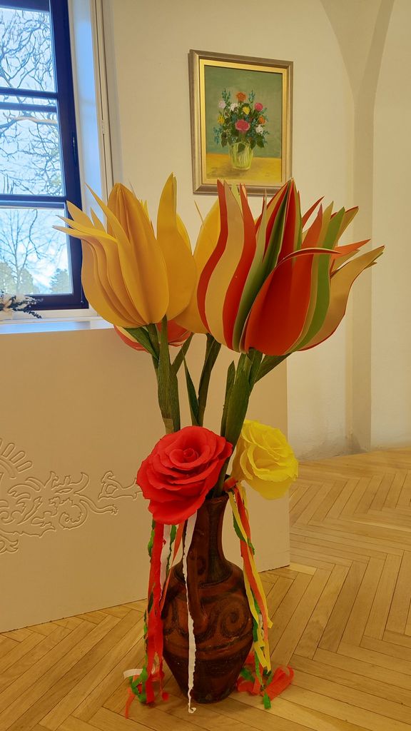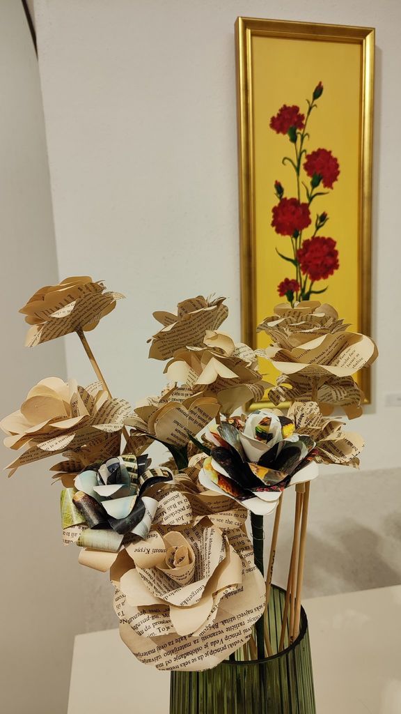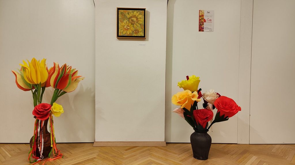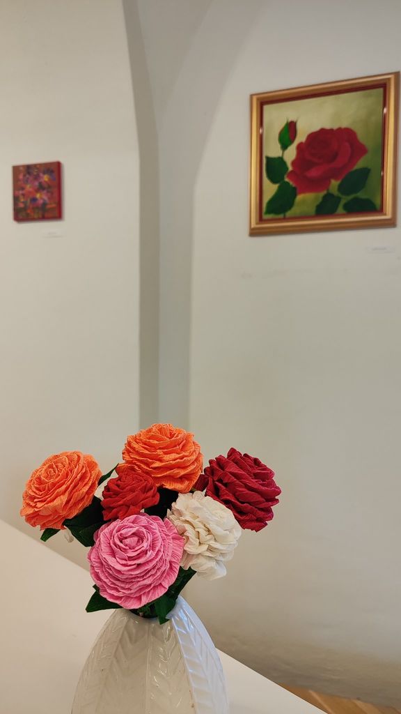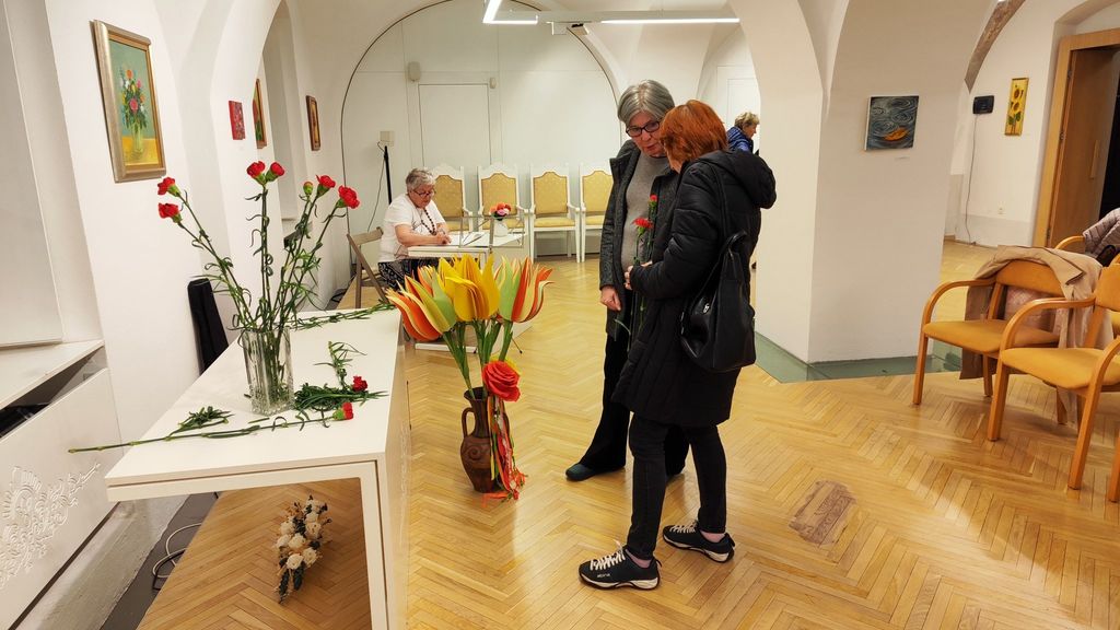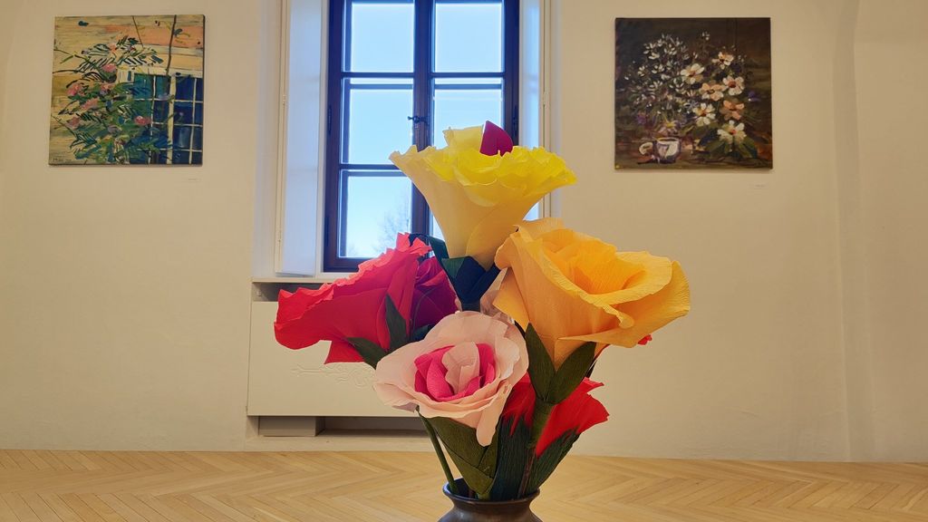 Članice kreativnih delavnic za odrasle (Ivanka Gorše, Rebeka Gulin, Silva Hertiš, Irena Ivančič, Majda Klemenčič Vodušek, Marjana Kopušar, Ivanka Kovačič, Vladka Novak, Mara Rajh, Olga Serdinšek, Vika Todorović, Mira Verdenik, Jožica Vidovič) so se predstavile s svojimi izdelki – cvetovi iz papirja, odpadnega časopisa, reklam, knjig in krep papirja, ki so nastali na delavnicah in druženjih, ki jih izvajajo ob sredah zvečer v prostorih knjižnice društva. Barvite, spretno oblikovane papirnate stvaritve se dopolnjujejo s slikarsko razstavo.