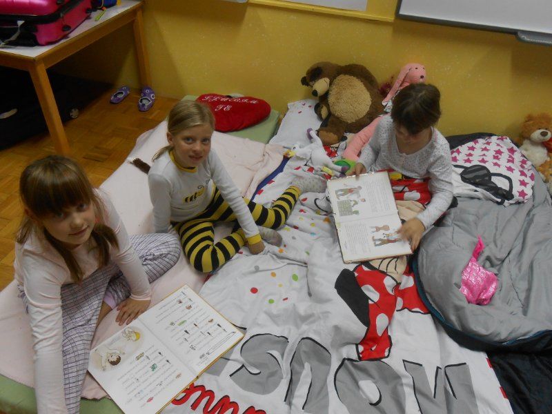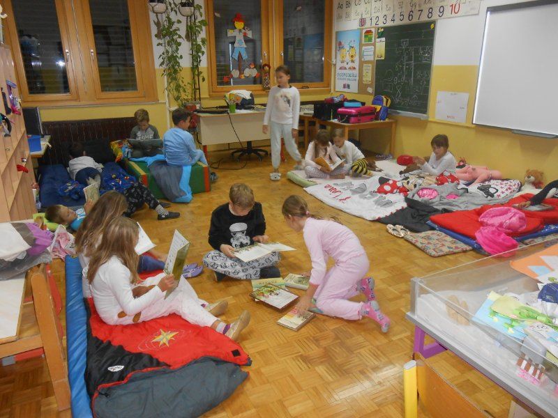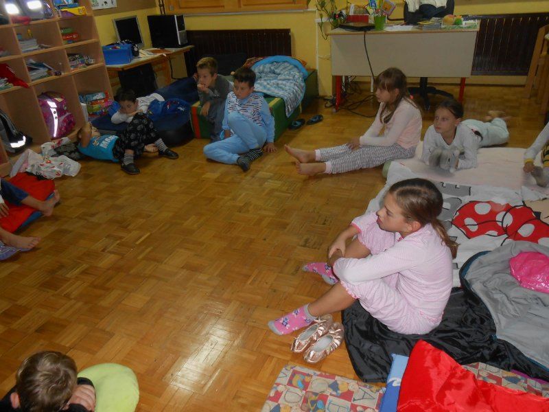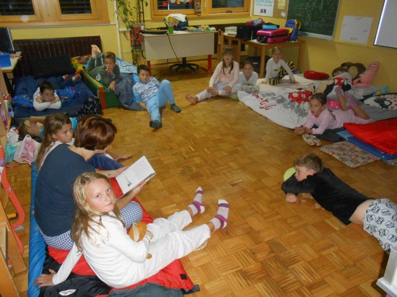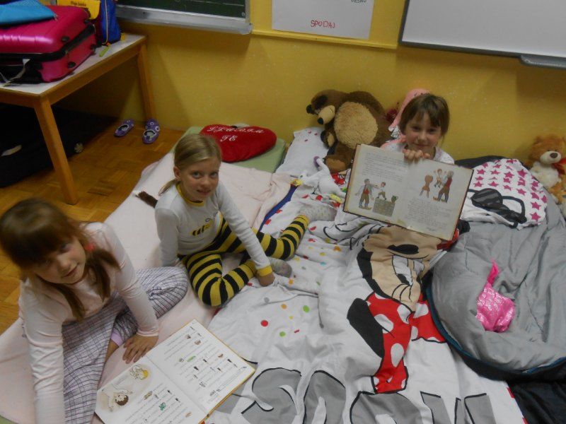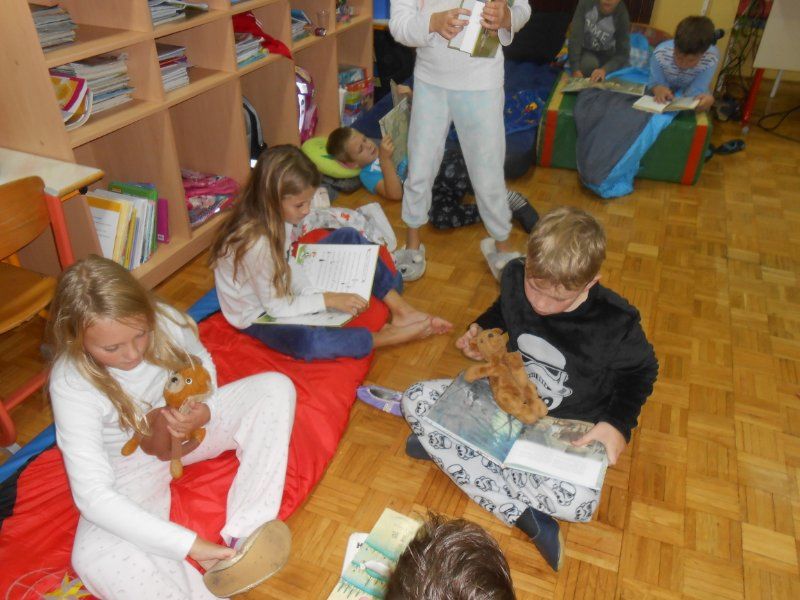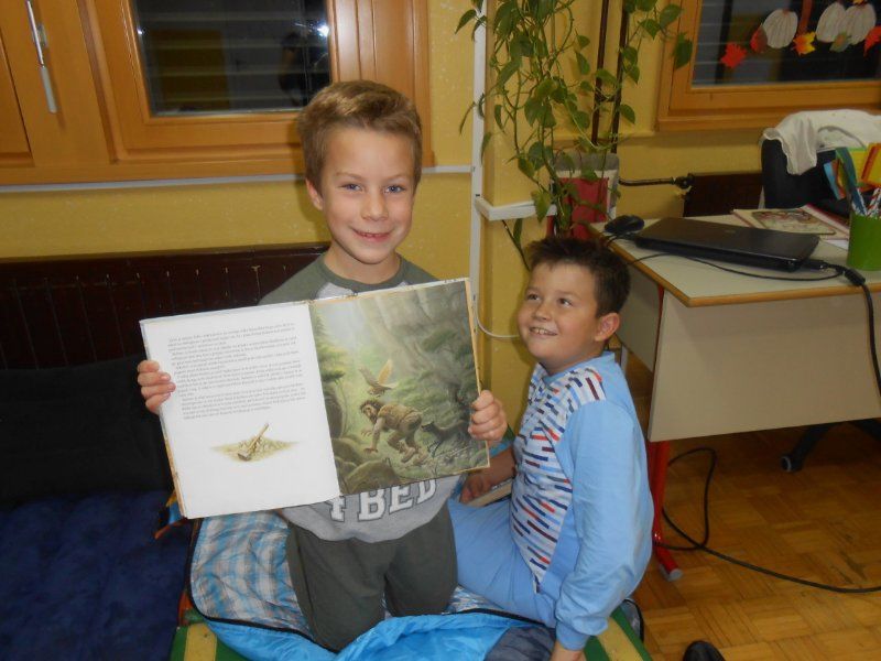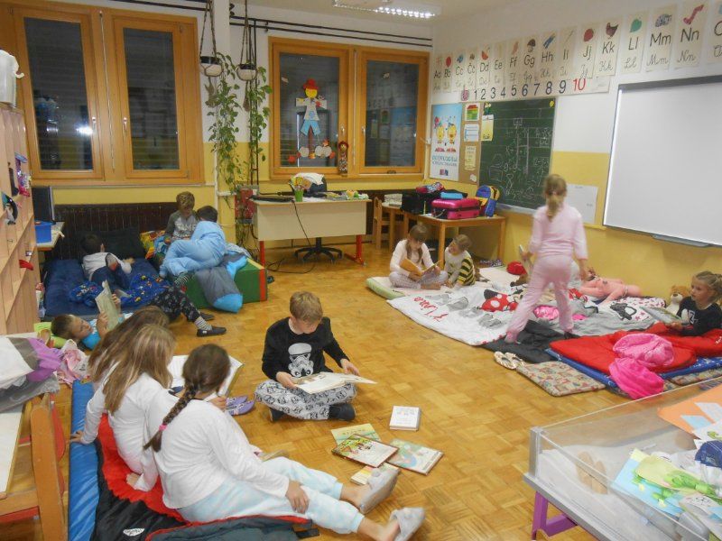 11. in 12. 10. 2018 smo imeli noč branja. Že zjutraj smo odšli v SNG Maribor. Ogledali smo si predstavo Gledališče od Ž do A. Bila je zelo smešna. Potem smo odšli v šolo, kjer nas je čakalo kosilo. Ko smo se najedli, smo lahko še malo jedli sladkarije, nato pa smo odšli ven. Tam smo jedli pečene kostanje, klobasice in kruh ter pili sok. Imeli smo tudi pastirske igre kot so zabijanje žebljev, streljanje s fračo in metanje podkev. Morali smo se preizkusiti v vseh igrah. Potem smo se lahko šli igrat. Zvečer smo odšli nazaj v avlo šole. Tudi tam je bila pripravljena igra. Bile so kartice na katerih so bile barve. Otroci, ki so imeli iste barve so sestavljali skupino. Imel sem vijolično barvo. Nato smo s svojo skupino predstavili to, kar je bilo naslikano na sličici. Potem smo se šli v razred malo igrat. Sledila je večerja, ki jo je pripravila masteršef skupina. Tudi pospravili so oni. Nato smo se odpravili v razred. Tam smo se preoblekli v pižame in umili zobe. Pred spanjem smo gledali film Bikec Ferdinand. Ko smo se naslednje jutro zbudili, smo nadaljevali z gledanjem filma. Potem smo odšli na malico. Pri angleščini smo gledali Mr. Beana in smešnice. Pri drugih predmetih pa smo se igrali. Samo pri naravoslovju smo se učili. Sledilo je kosilo in podaljšano bivanje.